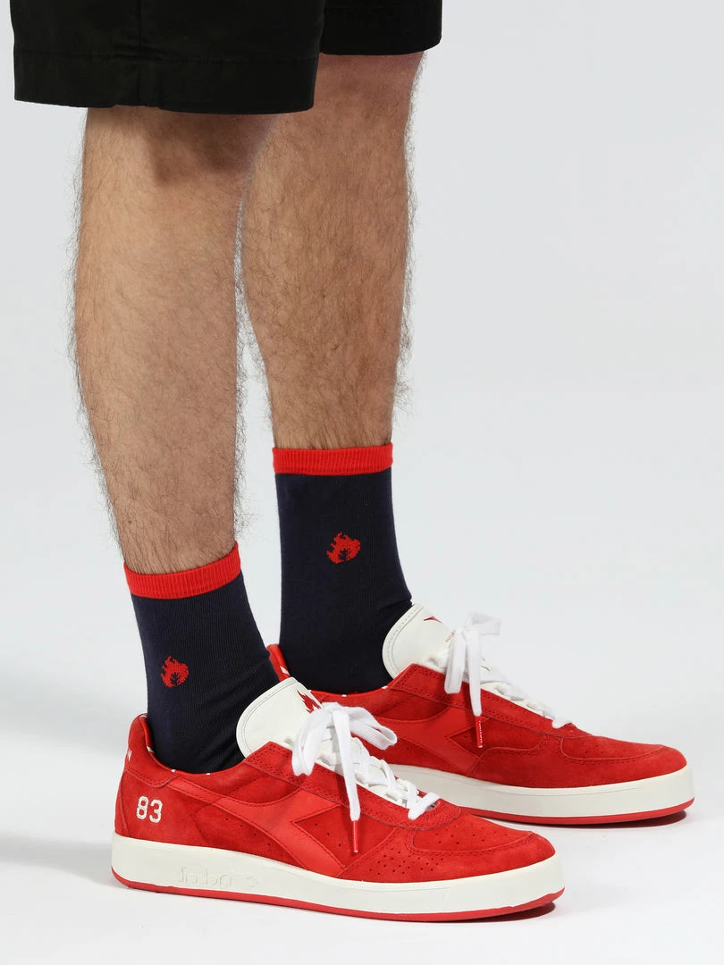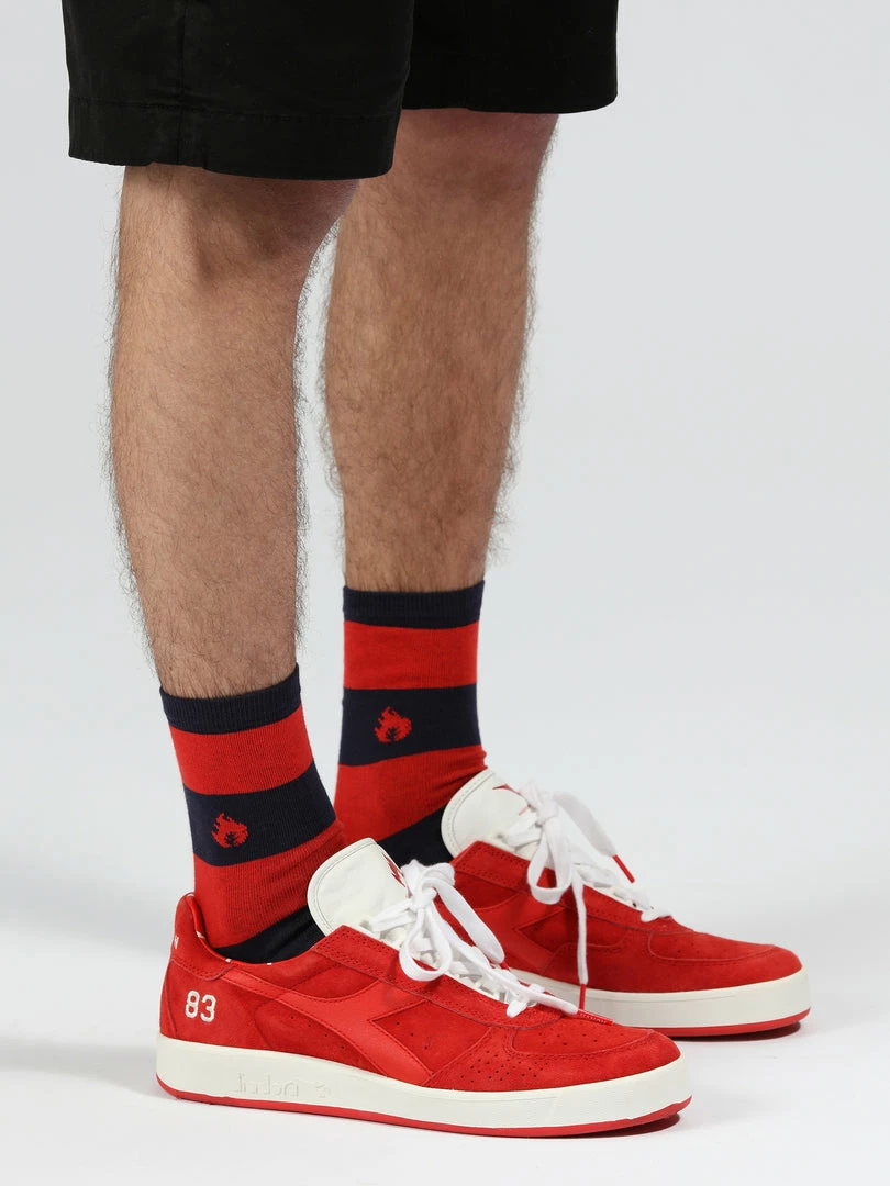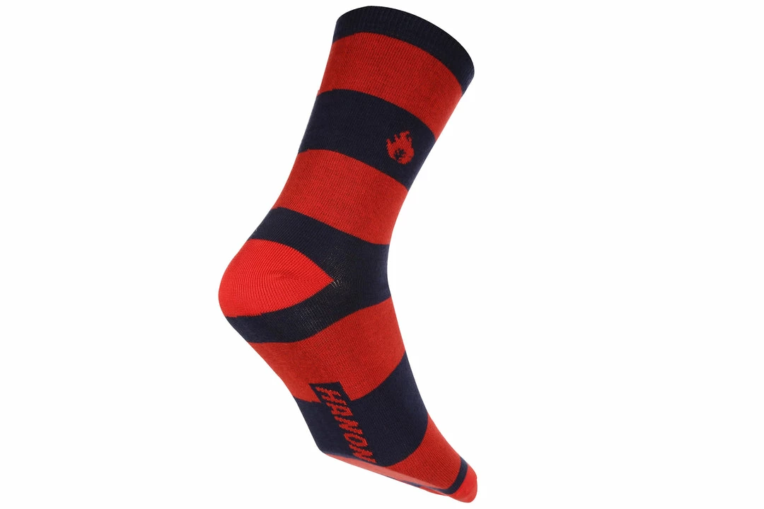 The HANON Tupack Sock is crafted in Portugal with woven HANON branding, and comes in a double pack which features a solid colourway with contrast rib, heel, and toe, and also a striped colourway with contrasting stripes.