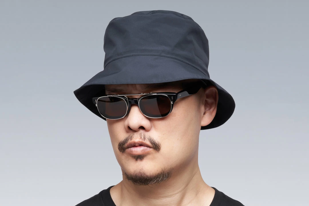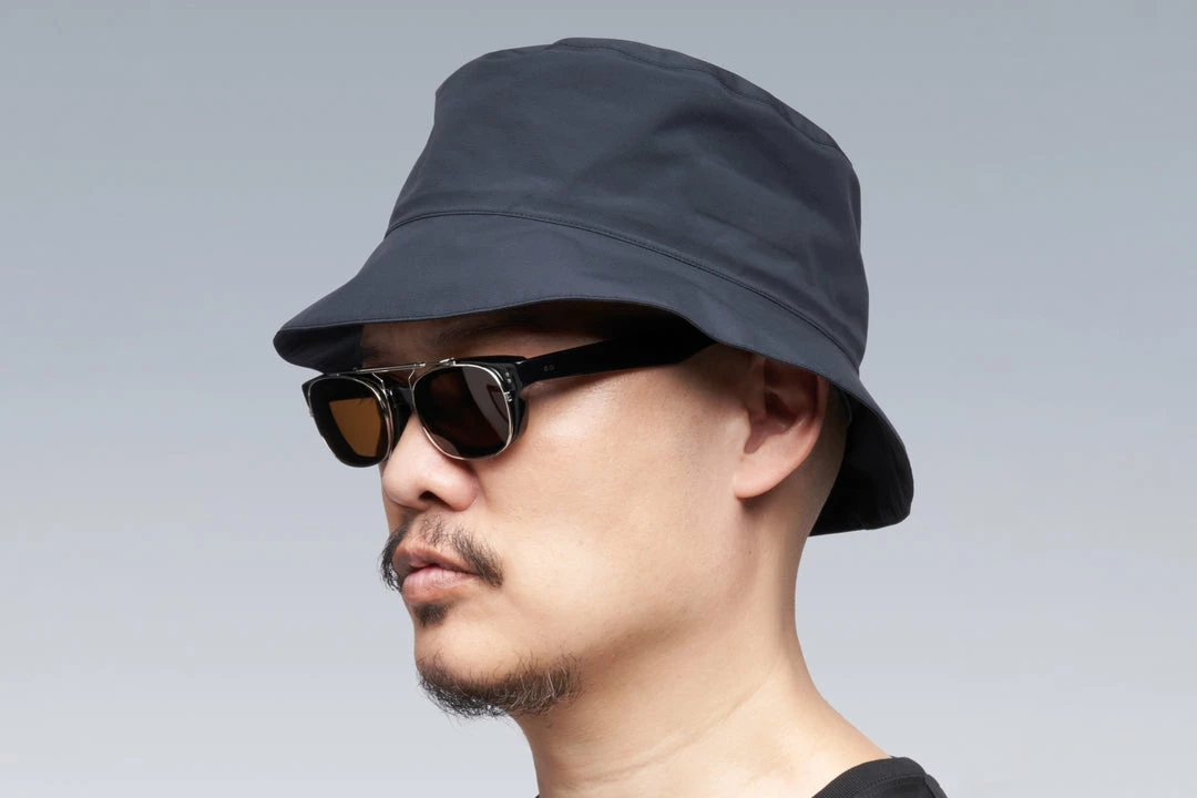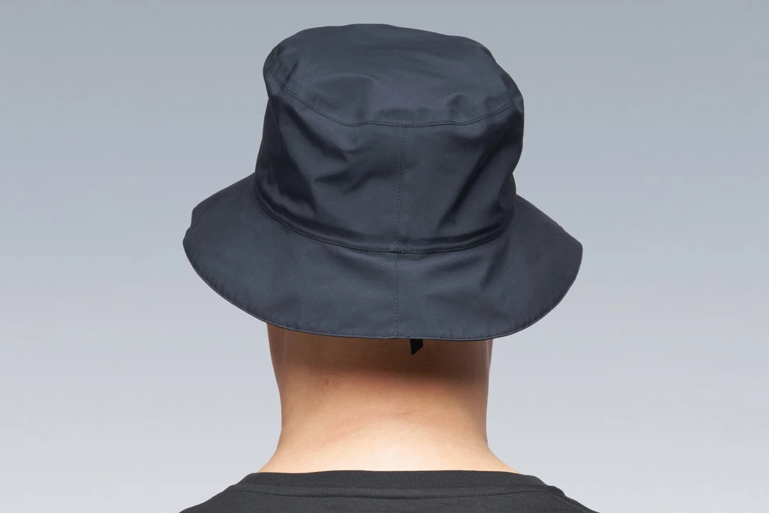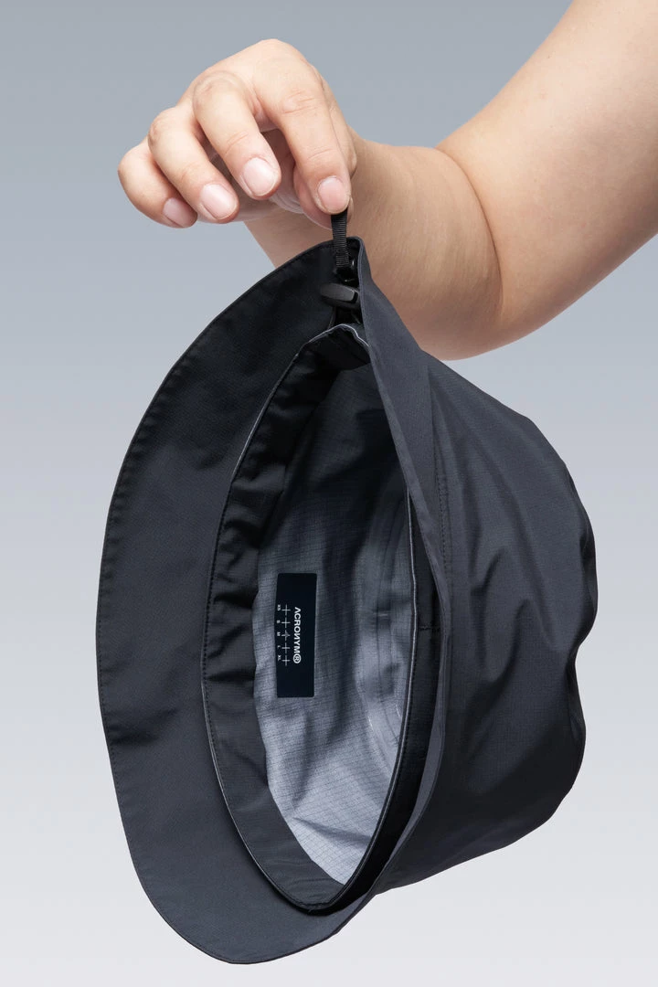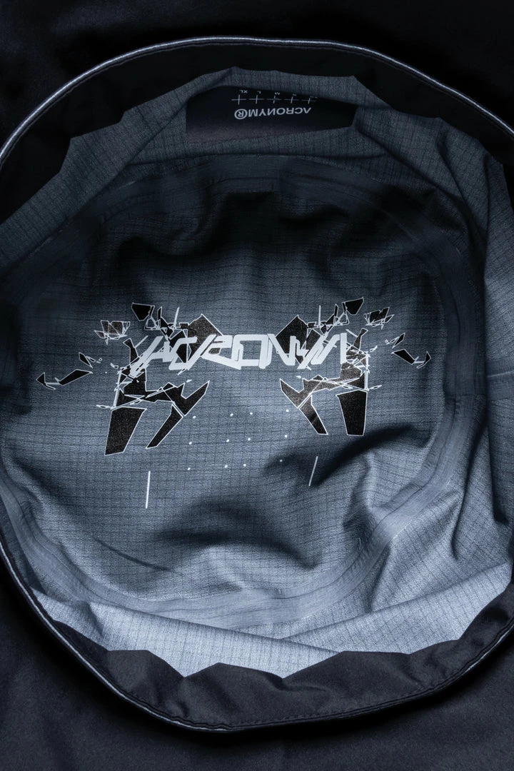 Stand alone 3L waterproof breathable GORE-TEX® PRO storm hat / hood substitute with adjustable circumference and internal print detail. Docks onto all Acronym jackets with a shockcord hem.