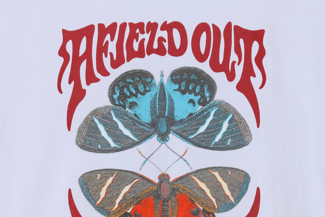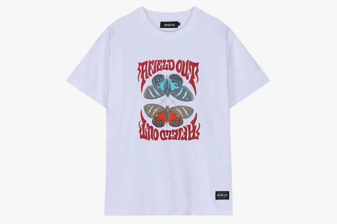 Introducing a new name to our ever growing line-up at HANON, Afield Out is an outdoor inspired clothing brand that provides everything from functional outerwear to essential camping accessories that take things off the beaten track. Expressive typefaces, natural graphics and functional design are just some of what Afield Out have to offer. The Swarm tee is a 100% cotton short sleeve T-shirt that features a symmetric butterfly design screen-printed on the front. Finished with a woven label at the bottom left side.