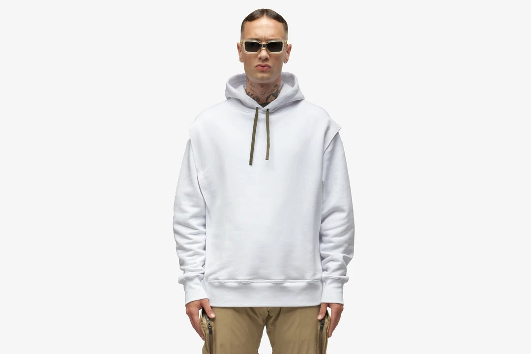Acronym drop B lands at HANON proving once again its futuristic function first design & high quality construction isΒ unlike anything else. Cleaned up and stealthed out, S26-PR combines the familiar comfort of a pullover hoody with an additional layer of more than meets the eye functionality. The doubled-up construction veils a generously proportioned kangaroo pocket and a hidden ‘delta- Ξ’ logo motif. Standard hoody drawstrings have been replaced with our proven rapid adjust tape (two layers of tape stitched together to form an ‘x’ cross section, allowing the tape to ‘lock-in’ when knotted, yet also remain easy to untie). Subtle embroidery details lets those who know know.