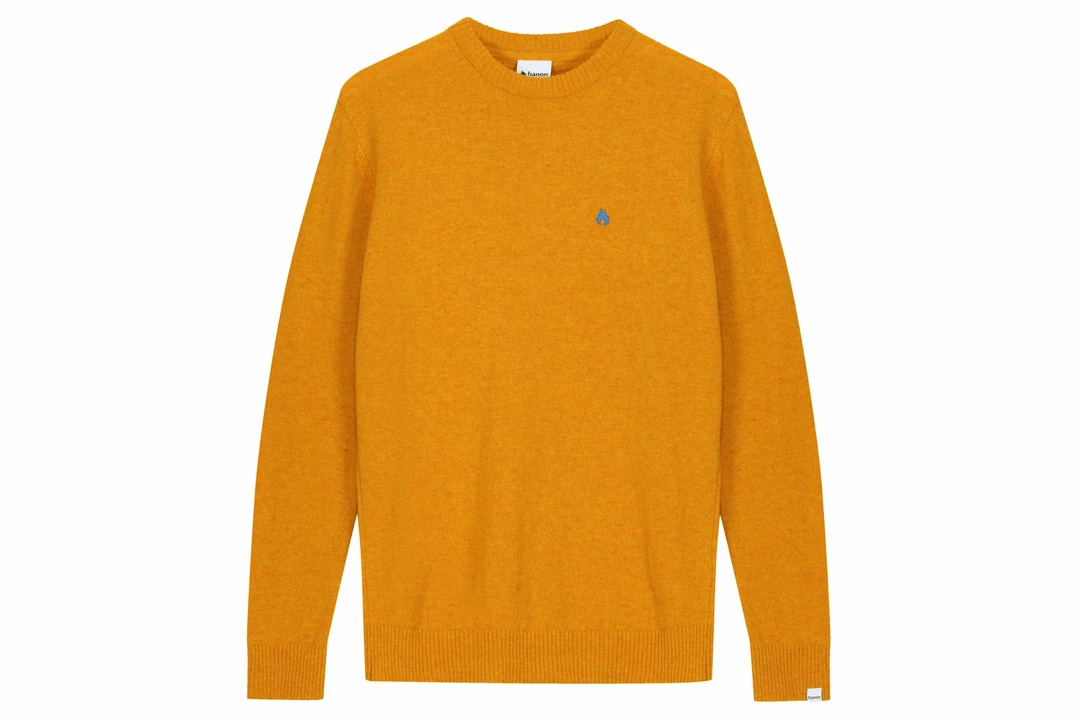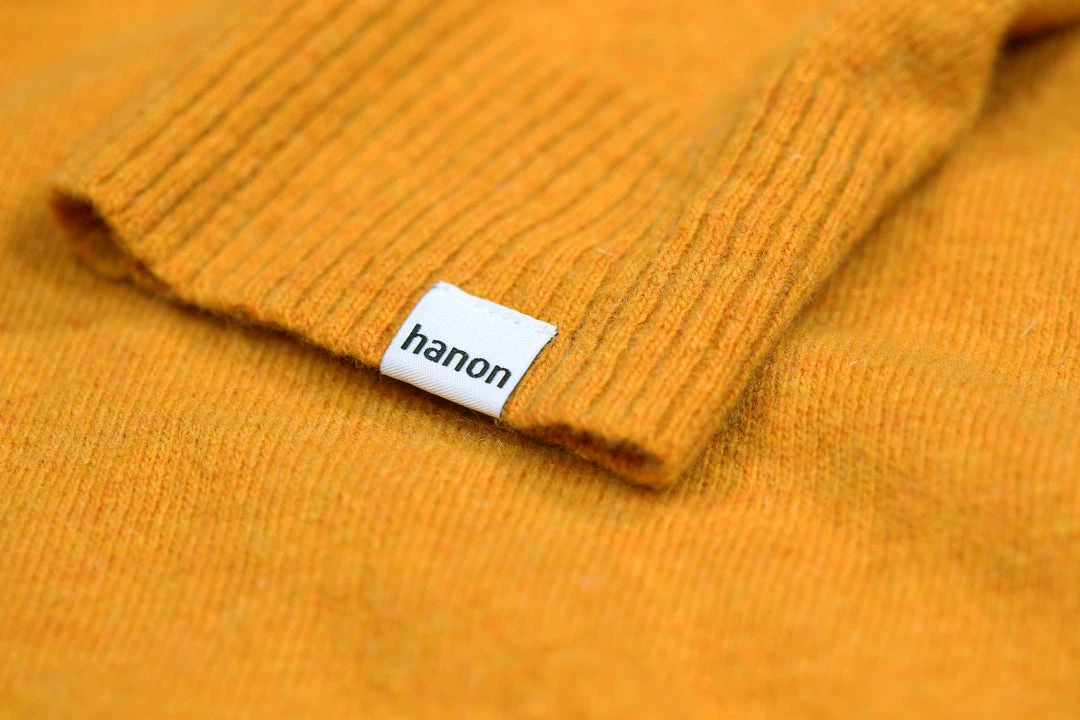 The HANON Classic Wool Knit in “Warm Yellow” is made in Portugal from soft Italian wool featuring an embroidered chest flame logo, ribbed neck, sleeves and hemline. A woven HANON clip label on the sleeve signs things off.