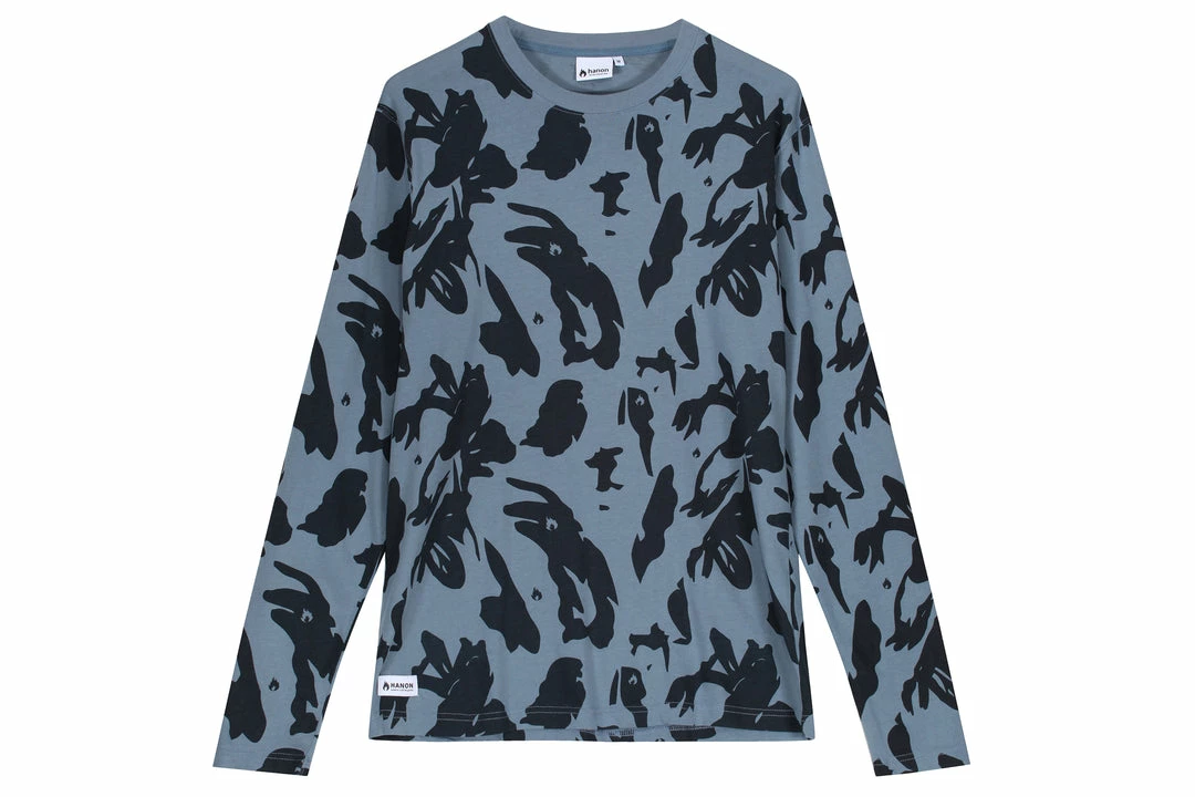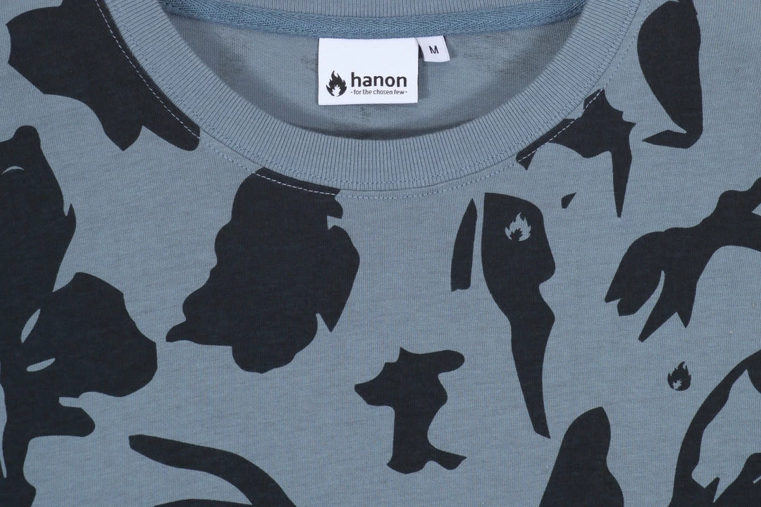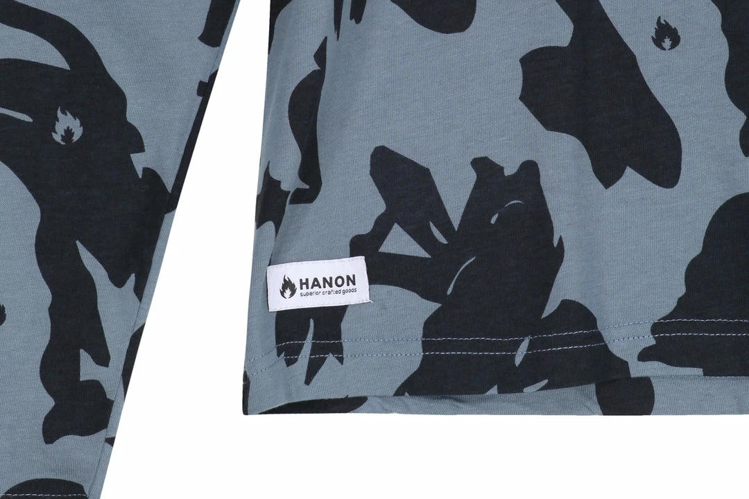 For Autumn/Winter ’18 our HANON collection returns, comprised of staples such as the Flame Badge series across t-shirts, sweats and hoods. Our Woven Shirt program also makes a welcome return with a distinctly autumnal palette, as well as a new range of graphics offered on a fresh selection of colours for the season. Here we have the Camo Long Sleeve Tee finished inΒ Raf Blue complete with wovenΒ HANON label on the right handΒ side of the garment.