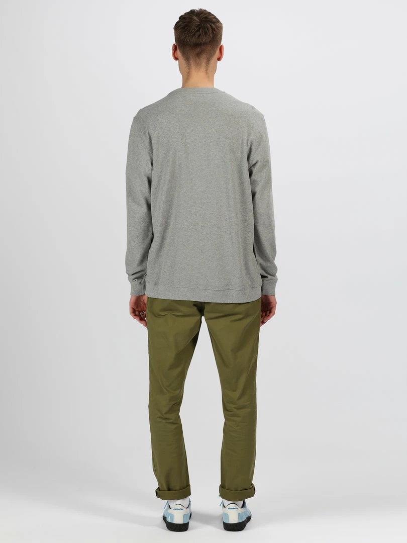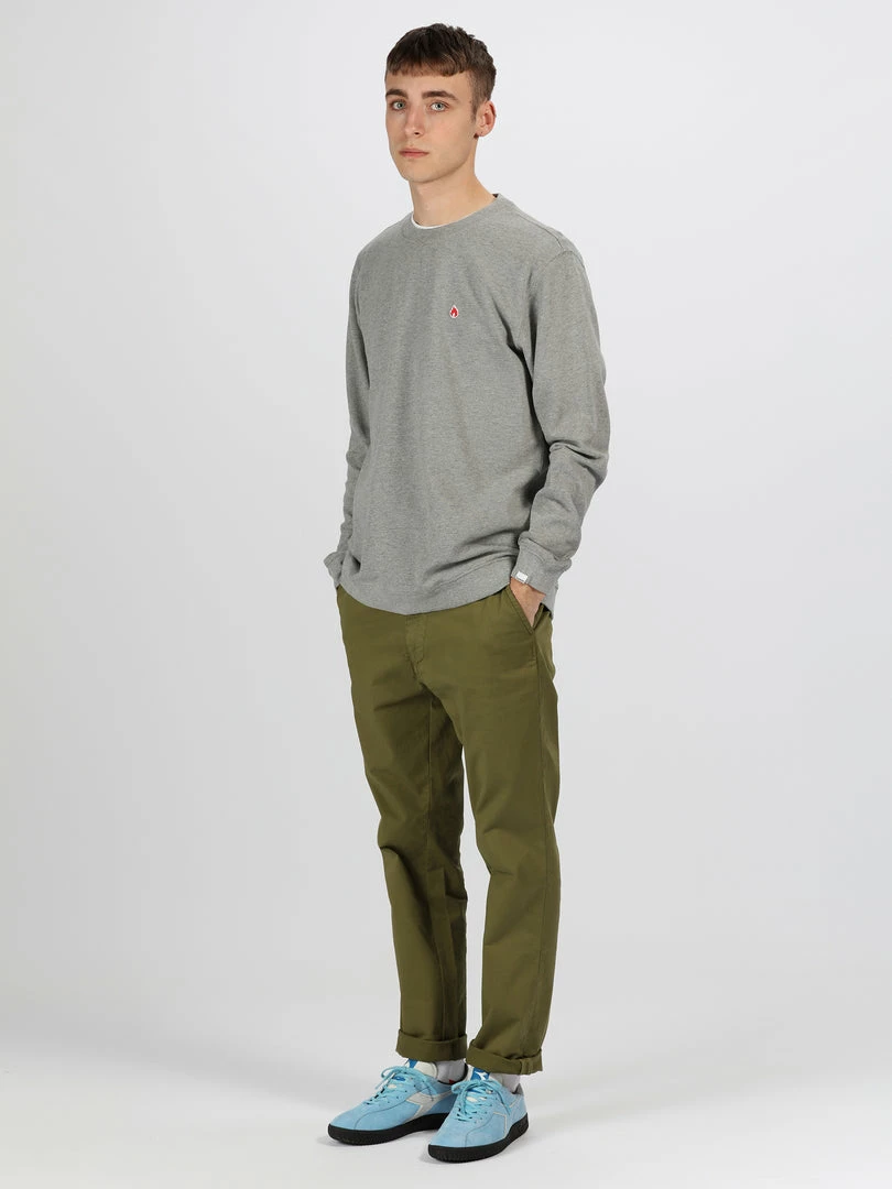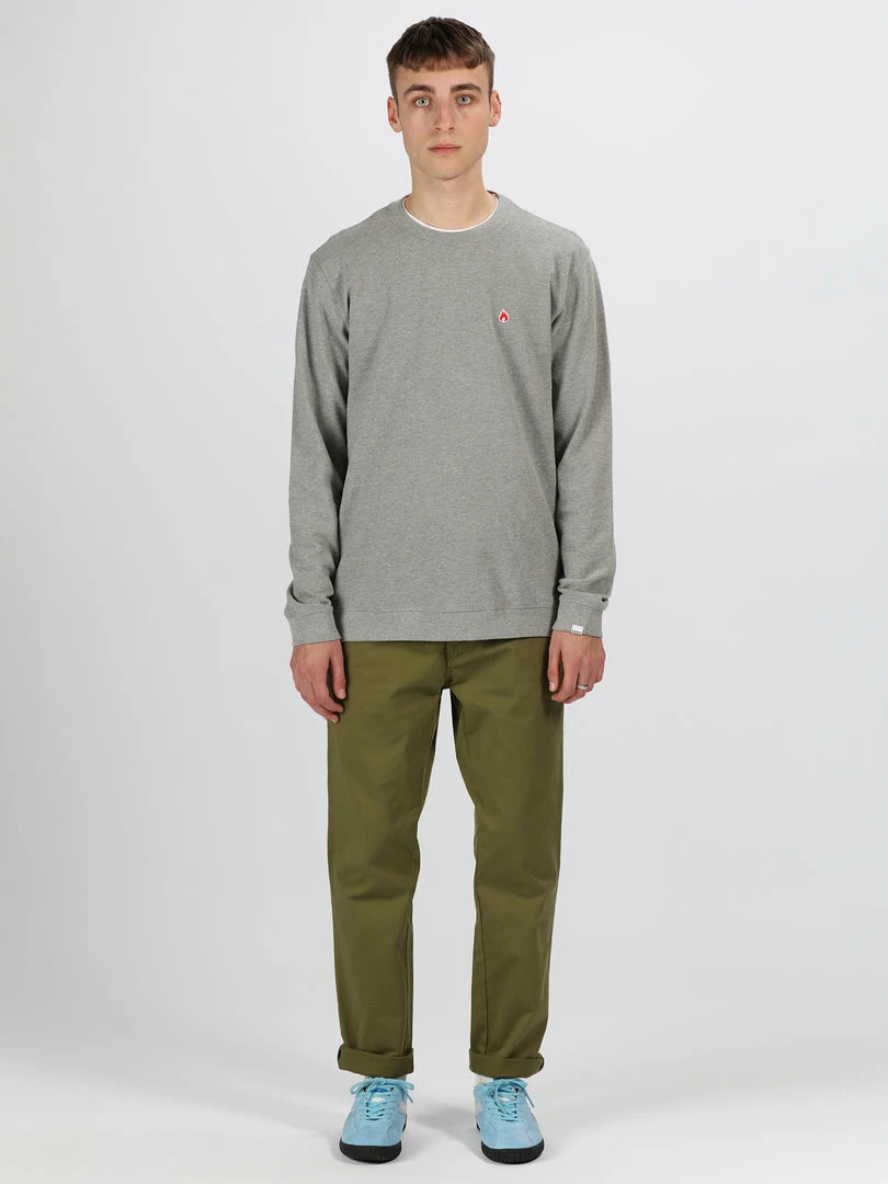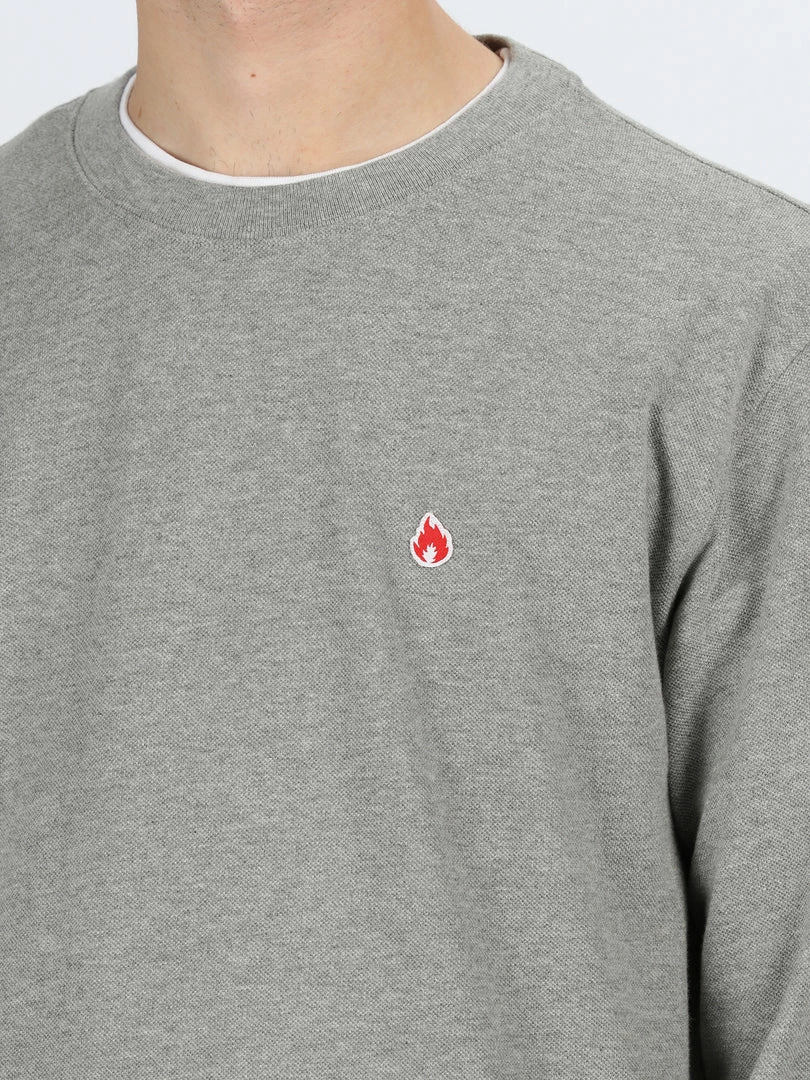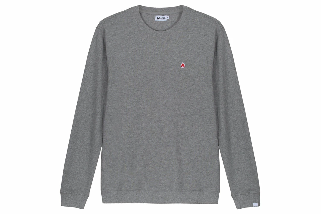 The HANON Pique Crew Sweatshirt in Grey is crafted in Portugal using 215gr cotton pique and features our Flame Badge on the chest, woven clip label on the sleeve, and has a ribbed collar and cuffs.