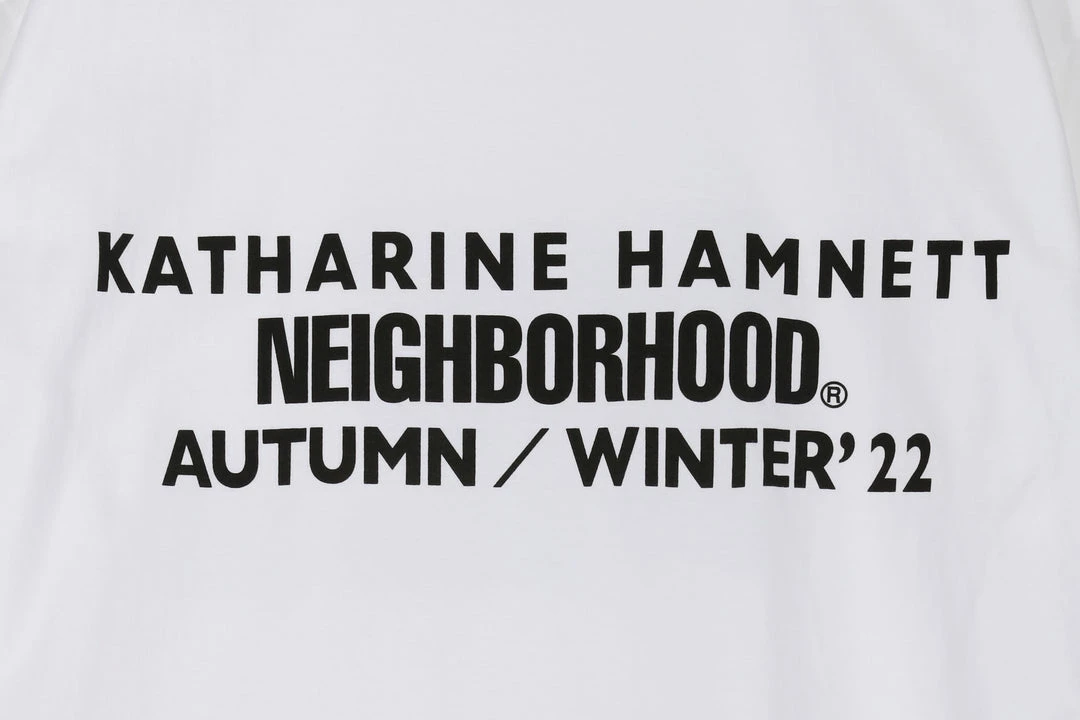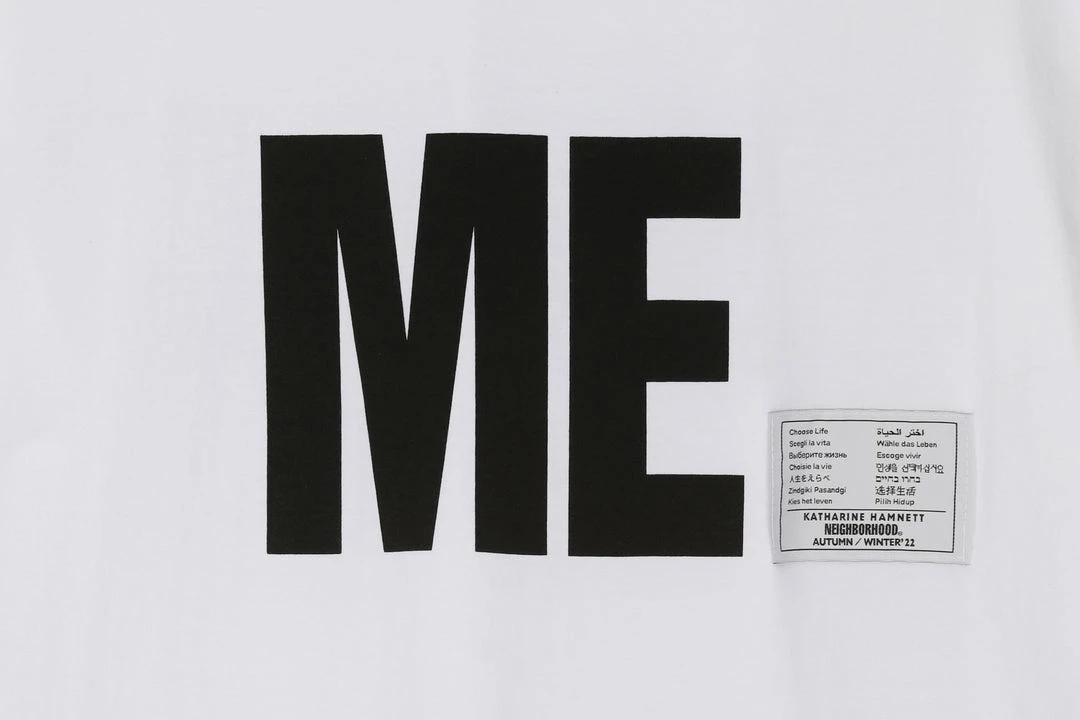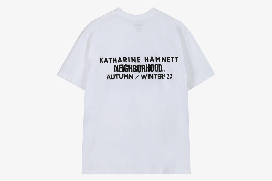 Neighborhood collaborates with Katharine Hamnett on a politically driven capsule that delivers messages from the core of 80s New Wave and various facets of club culture. The collection draws on Hamnett’s archival works, with her bold typographic works gaining critical acclaim in he fashion scene as well as wider pop culture. Rubber printed on a 100% cotton T-shirt with a special collaboration woven label.