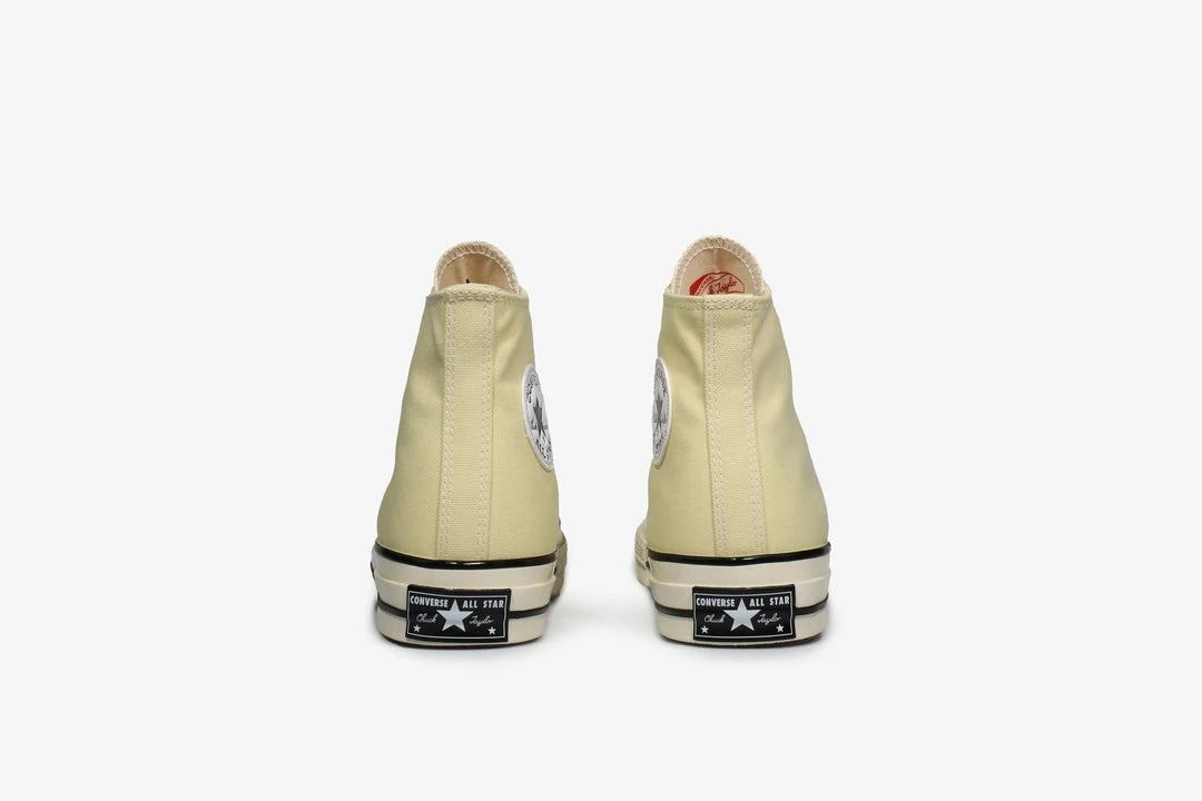 TheΒ Chuck 70 Hi “No Waste Canvas” uses 100% recycled PETΒ yellow canvas for the upper keeping things green, clean and well seen. All the classic Converse features are there like the glossy vulcanised sole unit with black foxing and the circular Chuck Taylor logo ankle patch. Finished with black rubber heel licence plates that complete the look.Β