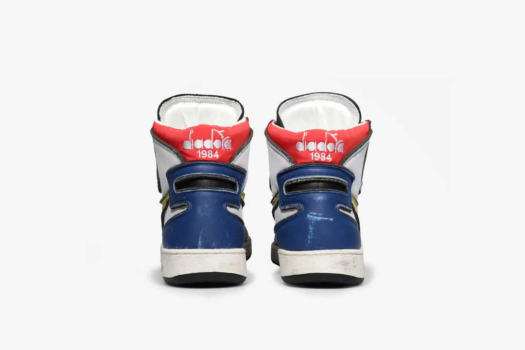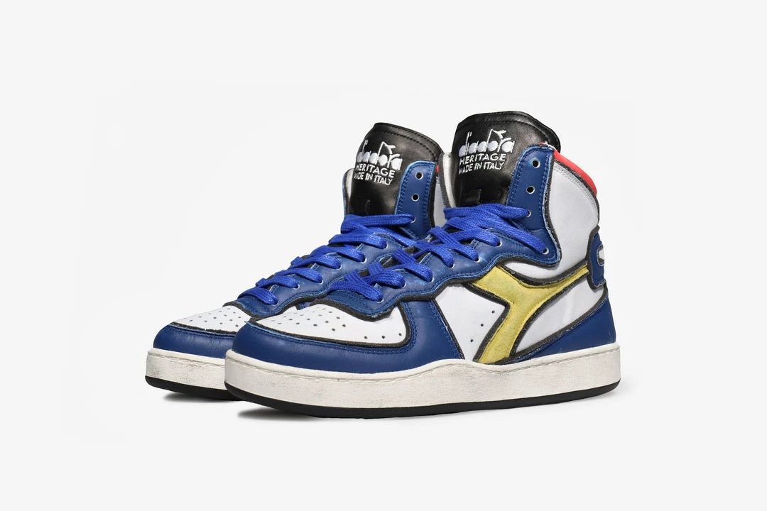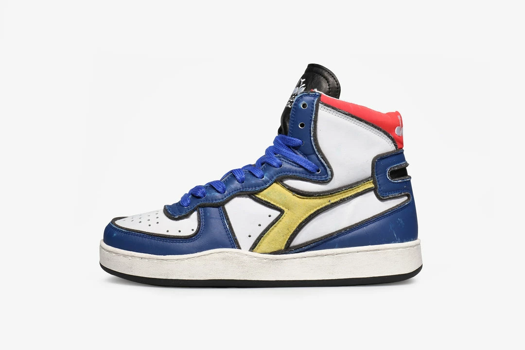 Diadora Heritage Mi Basket Dessau sneaker is made of used-effect leather in shades of white, black and blue. Featuring round perforated toe, side logo in yellow suede, contrasting detail on the back, fabric lining and leather insole and a white rubber sole the MI Basket Dessau is a shoe Diadora given the upmost attention to detail. The used-effect of the leather on these shoes combined with the great attention to detail by Diadora create a really vibrant and unique shoe.