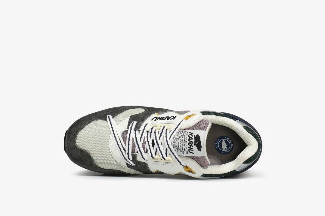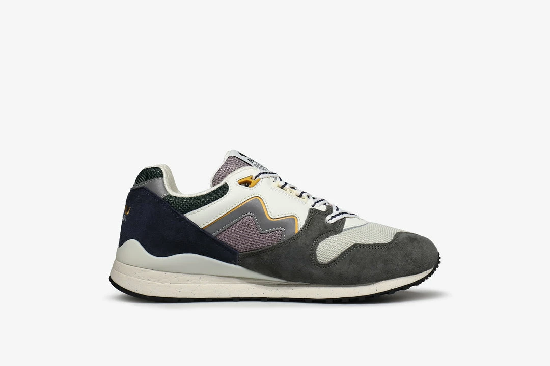 The Synchron Classic’s dual density construction remains true to the original version from the early 1990s, also making use of a double density air-cushioned midsole which provides extra comfort and support. Here the Synchron’s mesh body is split into 3 colours adding an extra dimension to the colourway with premium cuts of grey and navy suede tying it all together. The Synchron lacing system passes over the toebox for a unique finish.