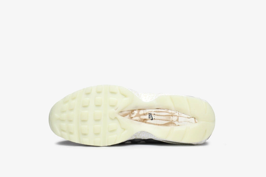 Move over milk, the power of the Air Max 95 is in town, and it’s got style you’ll feel all the way to your bones. Taking inspiration from the human body and ’90s track aesthetics, it taps into “The Anatomy of Air” with a skeletal-inspired colourwayΒ and midsole print representing the inside of a bone. Premium suede, glow-in-the-dark details and a surprise on the bottom finish it off. Happy Halloween!