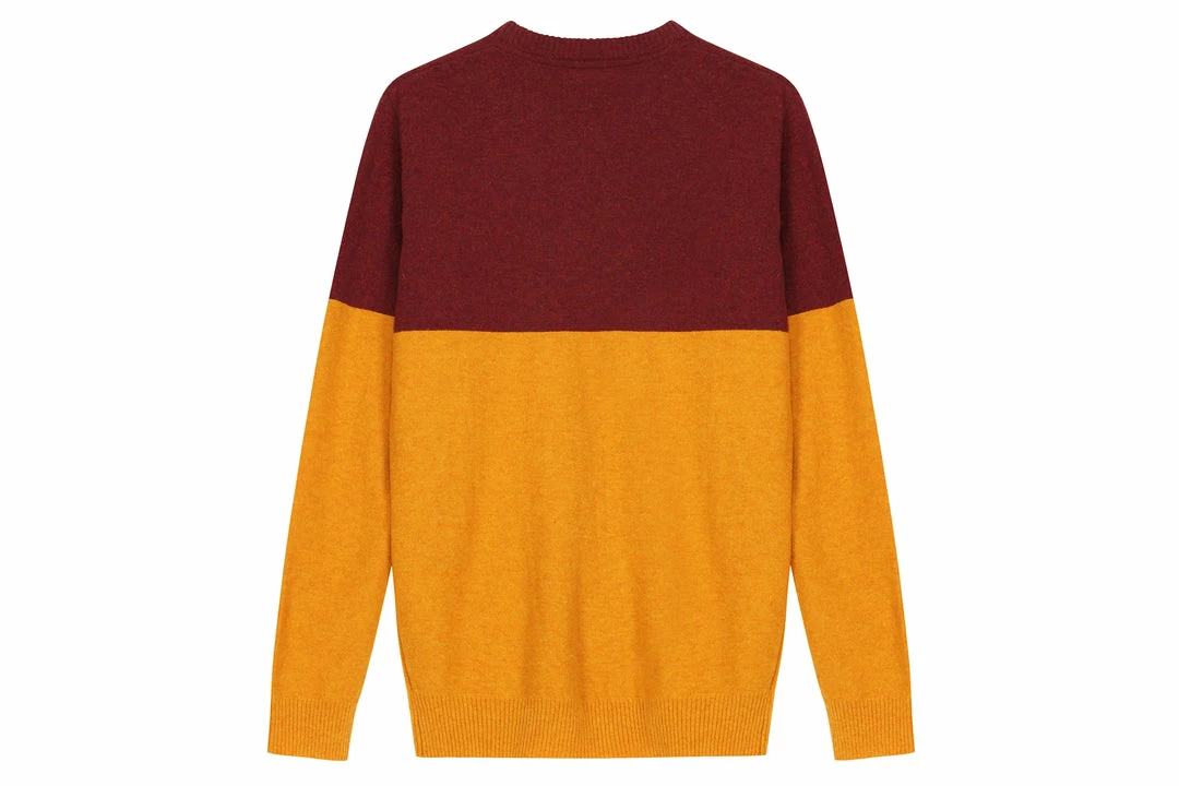 The HANON Blocked Wool Knit in “Warm Yellow/Burnt Orange” is made in Portugal from soft Italian wool featuring an embroidered chest flame logo, ribbed neck, sleeves and hemline. A woven HANON clip label on the sleeve signs things off.