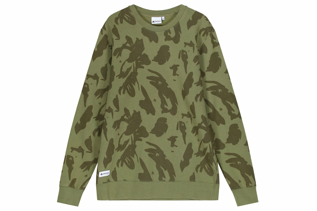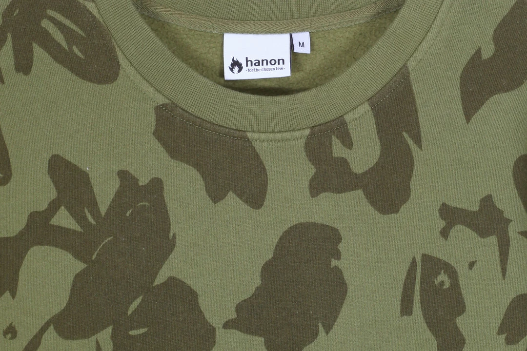For Autumn/Winter ’18 our HANON collection returns, comprised of staples such as the Flame Badge series across t-shirts, sweats and hoods. Our Woven Shirt program also makes a welcome return with a distinctly autumnal palette, as well as a new range of graphics offered on a fresh selection of colours for the season. Here we have the Camo print sweatshirt finished in Military Green complete with woven HANON tab on the bottom right side.