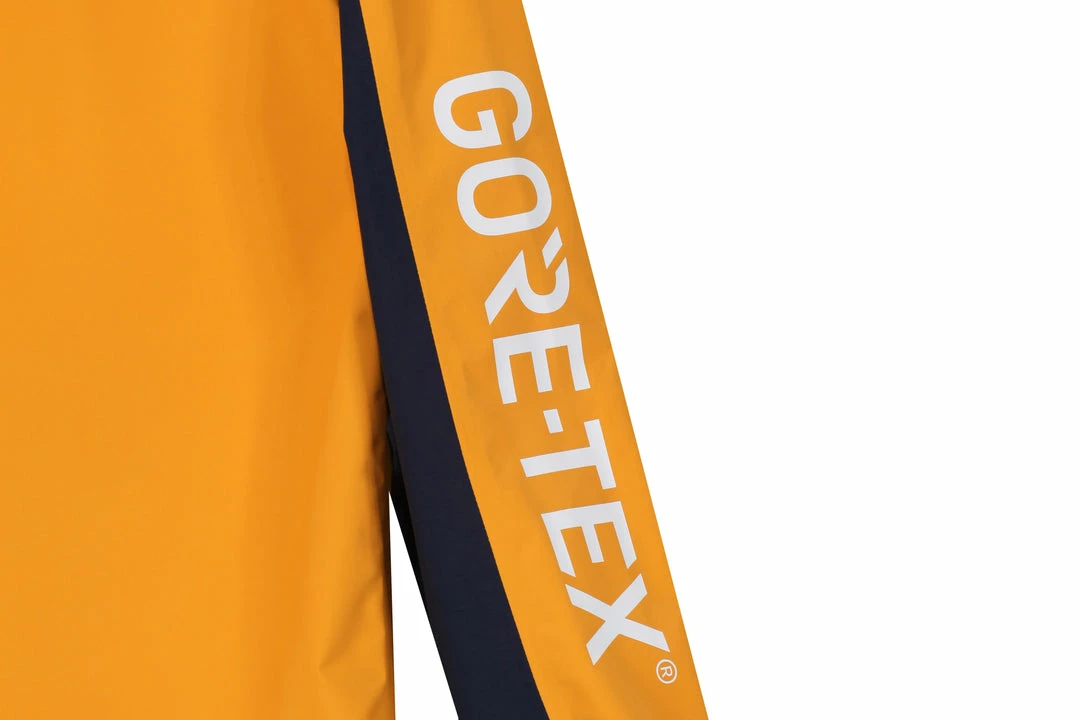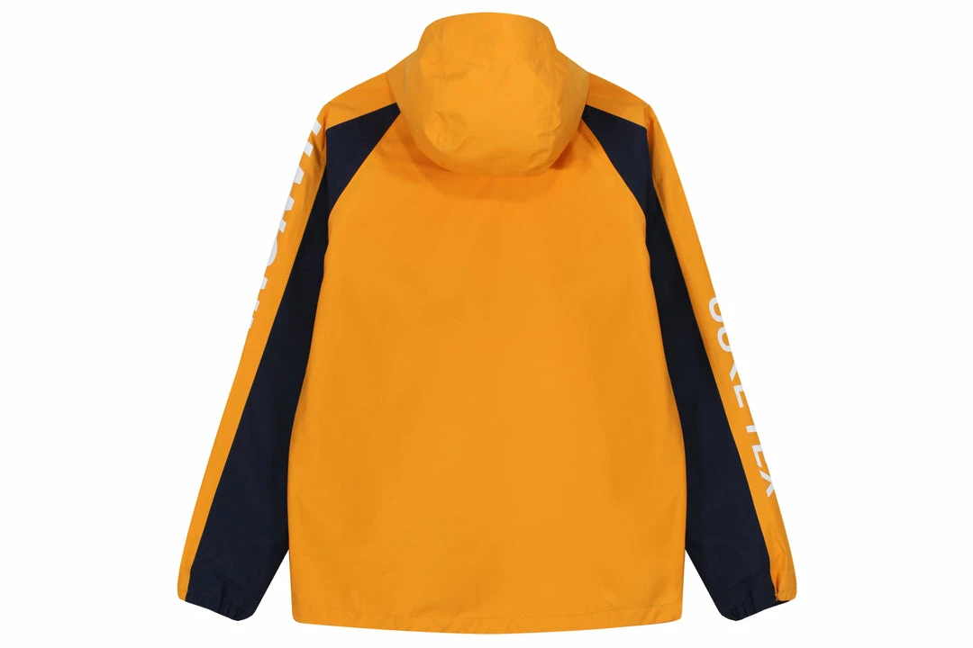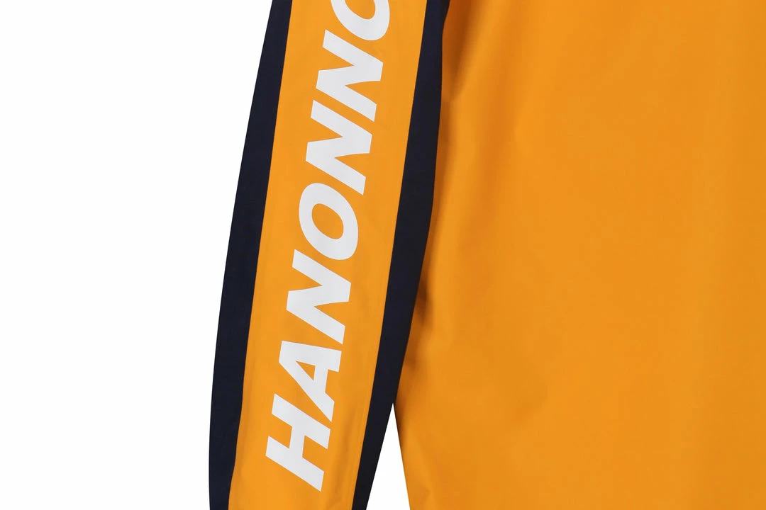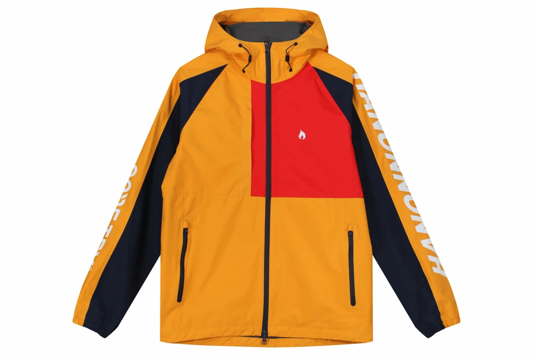 For Autumn Winter 18 we debut our Mountain Parka as part of our Gore-Tex Research Project. Produced from Gore-tex’s Paclite technology offering an lightweight construction that keeps out you cool in demanding activities and warm when the temperature cools. Offered here in a Golden Yellow, Red & Navy Tri-Colour makeup with taped seams and zips. HANON & Gore-Tex branding appears via a heat transfer on the arms and via woven labels in the lining. A peaked hood and elasticated cuffs ensure comfort and performance.