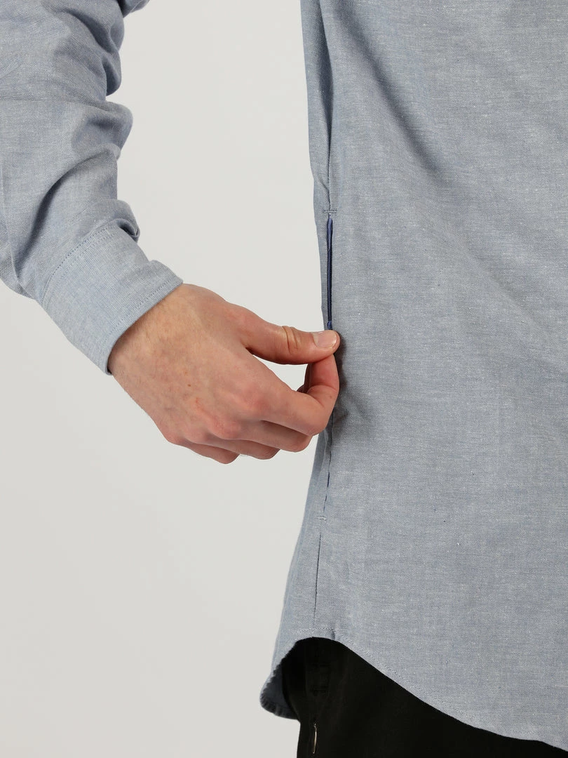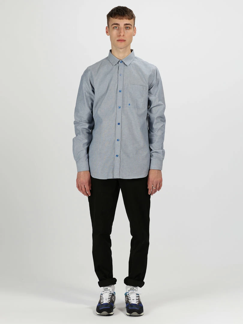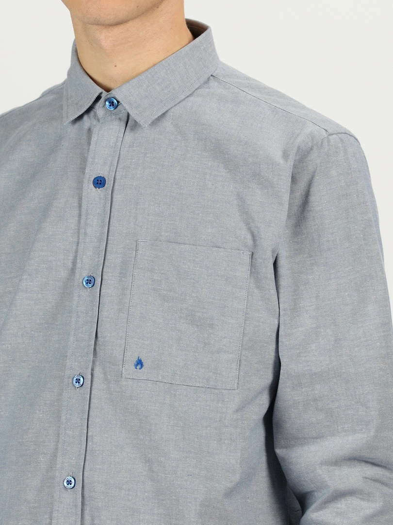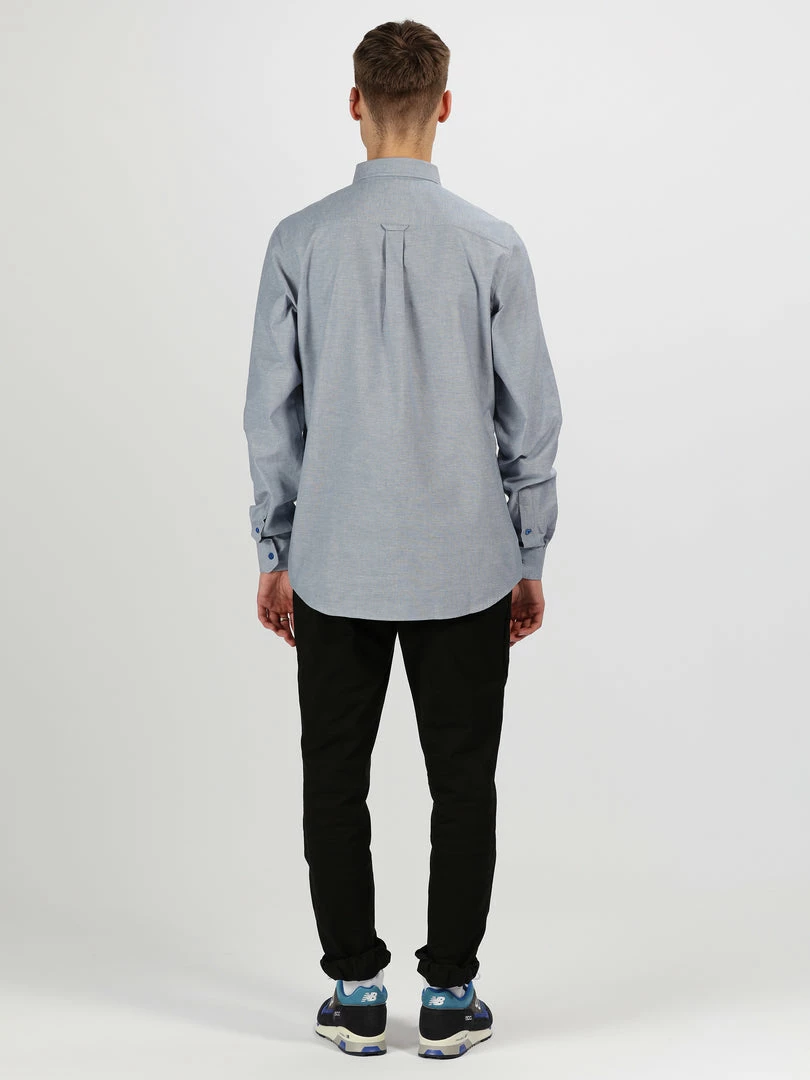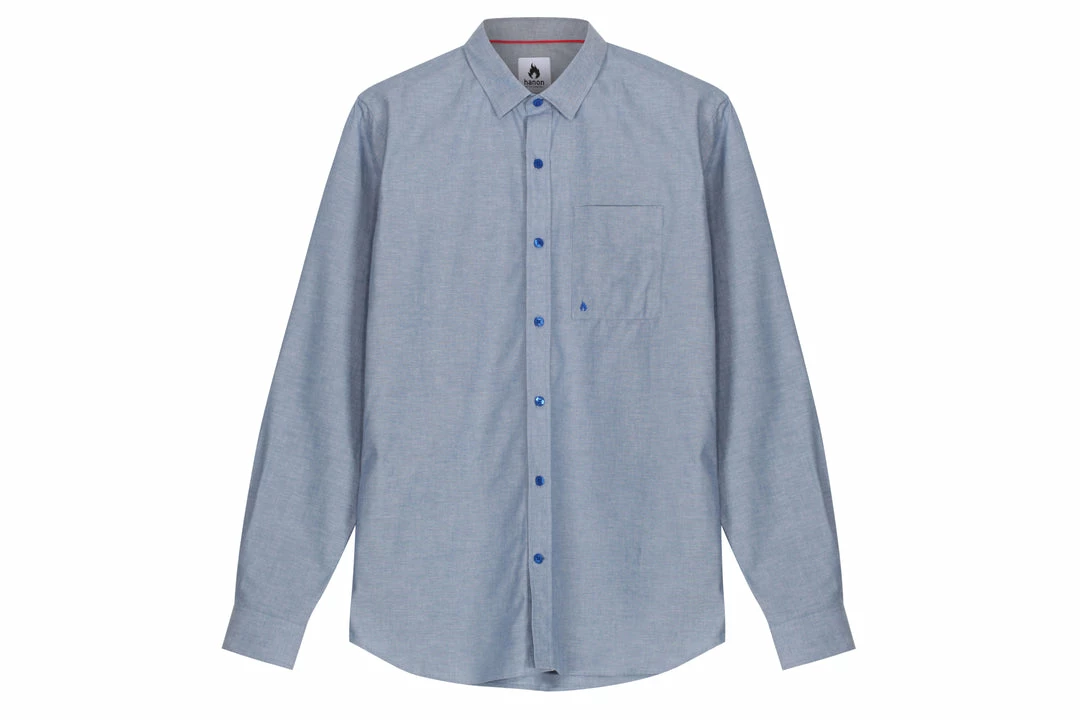 The HANON Hilton Shirt is crafted in Portugal using 145gr cotton and features a buttoned down collar, chest patch pocket with embroidered flame and hidden credit card pocket, double buttoned cuffs, hidden placket label, and a concealed side pocket.
