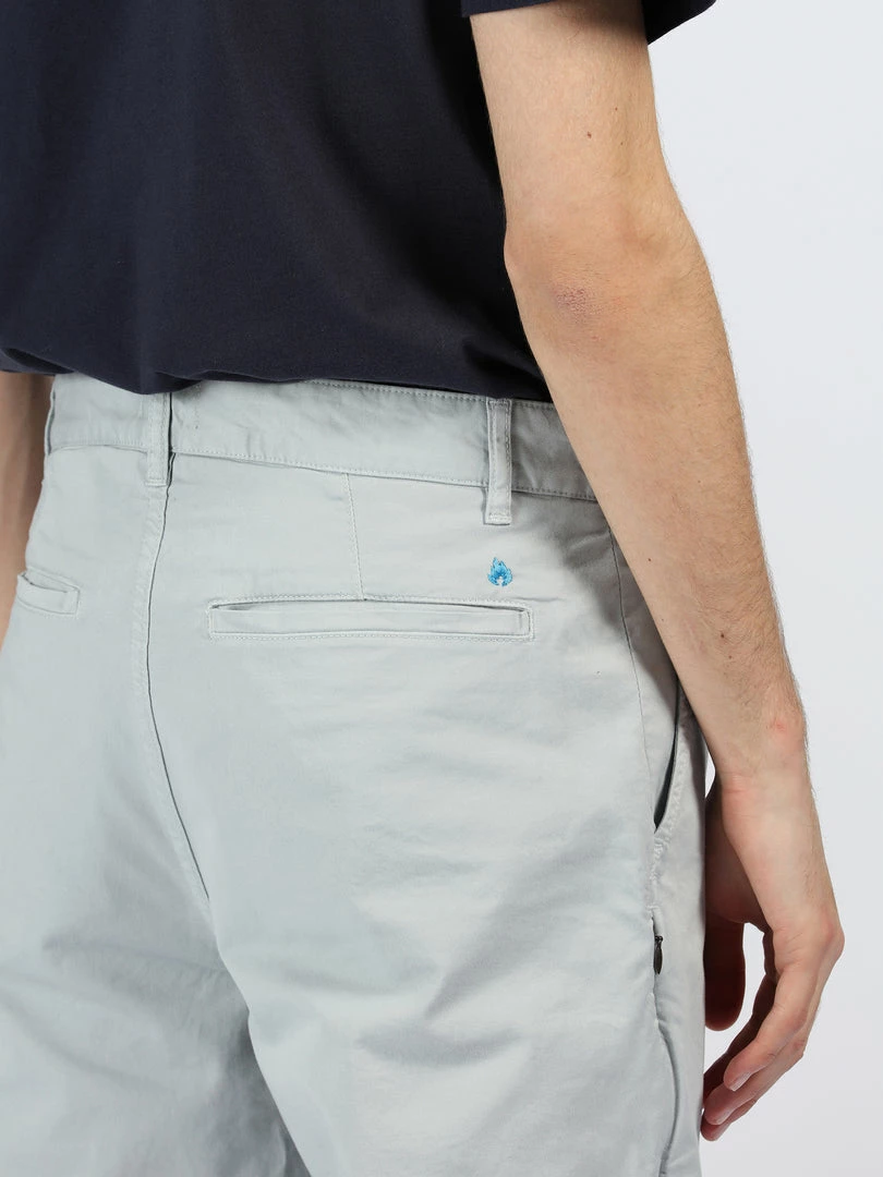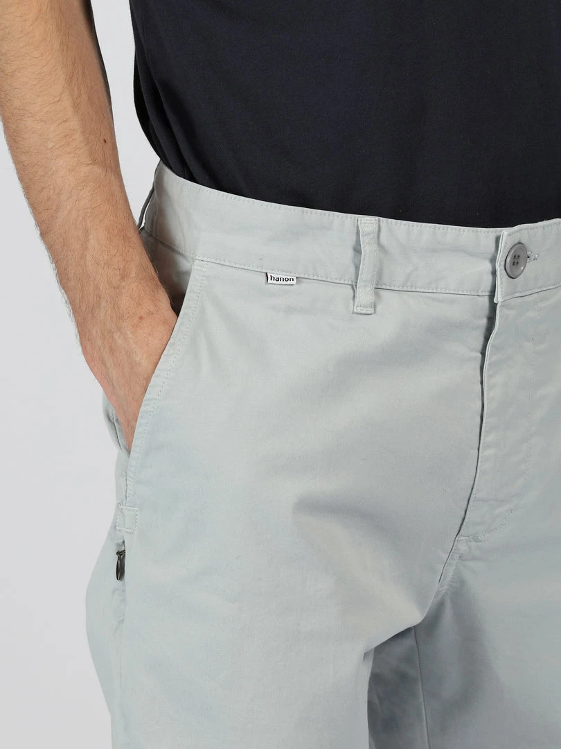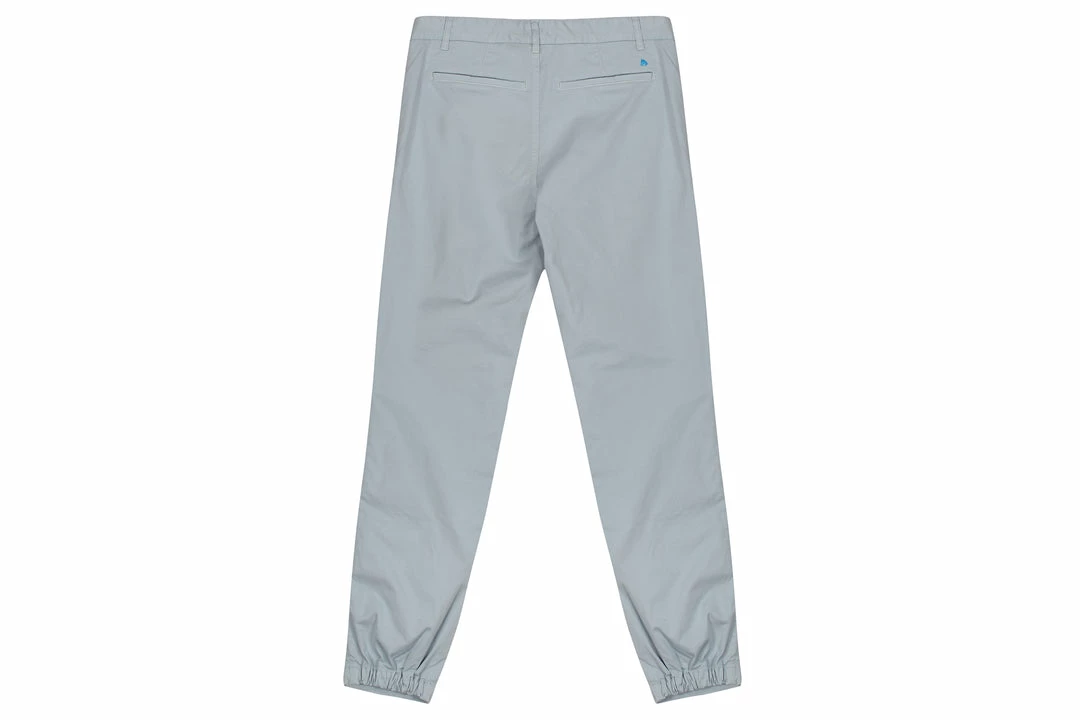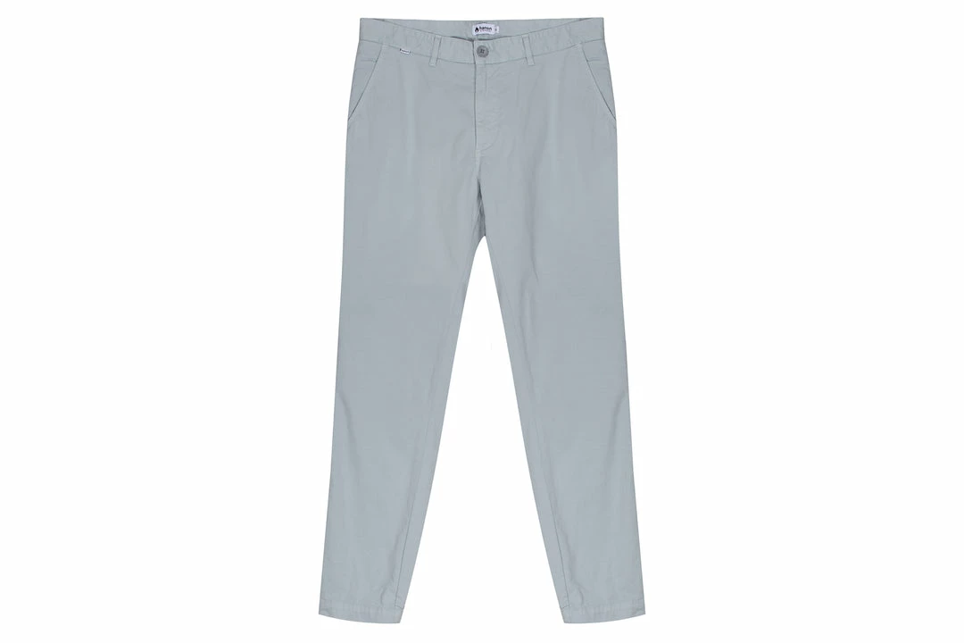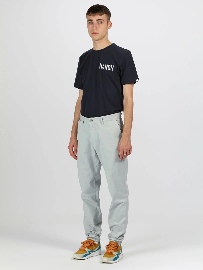 The HANON Relaxed Cyrus Chino in Pearl Blue is crafted in Portugal using 240gr garment-dyed cotton twill and features a rear elasticated cuff, double side entry pockets, woven flag label, single welt rear pockets, flame embroidery, YKK zip fly, and a concealed zip side pocket.