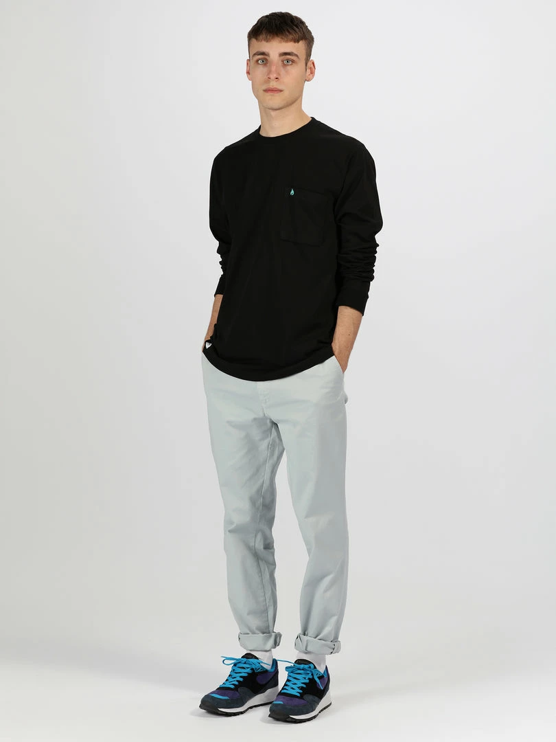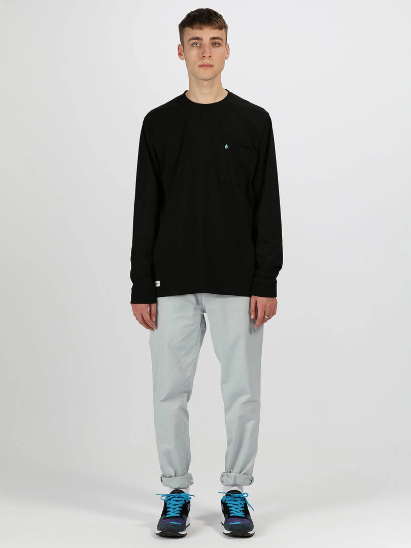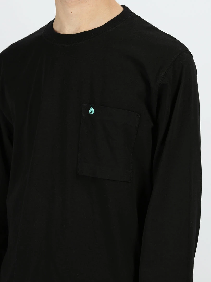The HANON Tavelty LS Tee in Black is crafted in Portugal using 160gr cotton jersey and features a chest patch pocket with an embroidered flame as well as ribbed cuffs.