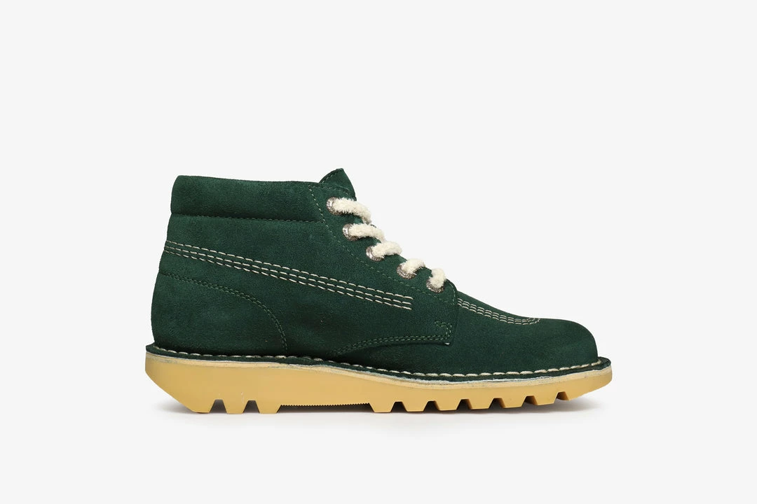 The Kickers Kick Hi feature quality leather uppers, trademark Kickers rubber soles for hardwearing, standout style and classic triple-stitch detailing. Theย suedeย will age naturally over time to create a very special pair of Kicks to add to your collection.ย Raw edges accentuate the quality and craftmanship of the product, iconic triple stitch detailing is also added on the toe and quarter.ย