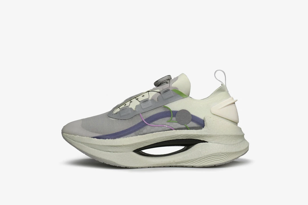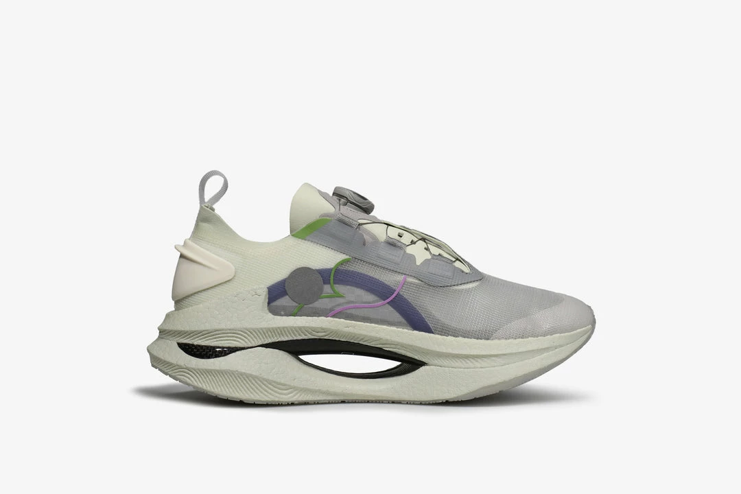 Denmark’s Soulland collaborate on Chinese brand Li-Ning’s Shadow model that isΒ undoubtedlyΒ from the future. The transparent mesh upper is tied together by a BOA lacing system that is quick and easy to use withΒ logo patches sitting above. Below the lightweight upper is this showstopper of a sole unit that looks like it’s from a different universe. A Boom tech midsole is paired with two carbon fibre plates supplying unmatchedΒ energy return as well as cloud-like cushioning.Β