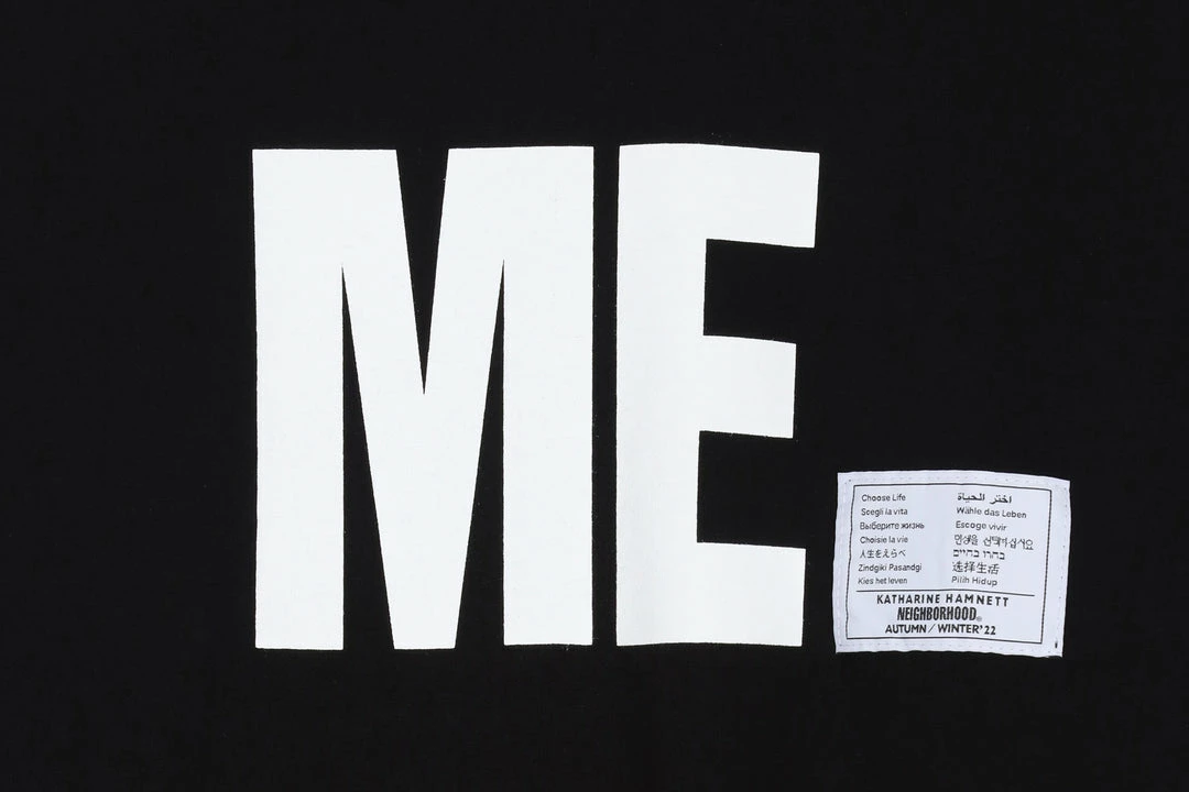 Neighborhood collaborates with Katharine Hamnett on a politically driven capsule that delivers messages from the core of 80s New Wave and various facets of club culture. The collection draws on Hamnett’s archival works, with her bold typographic works gaining critical acclaim in he fashion scene as well as wider pop culture. Rubber printed on a 100% cotton T-shirt with a special collaboration woven label.