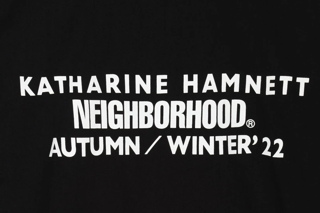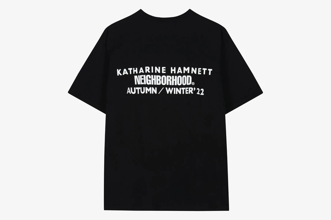 Neighborhood collaborates with Katharine Hamnett on a politically driven capsule that delivers messages from the core of 80s New Wave and various facets of club culture. The collection draws on Hamnett’s archival works, with her bold typographic works gaining critical acclaim in he fashion scene as well as wider pop culture. Rubber printed on a 100% cotton T-shirt with a special collaboration woven label.