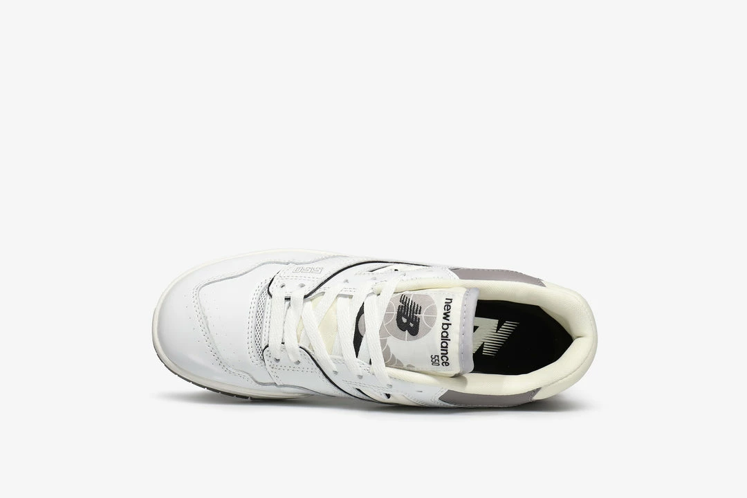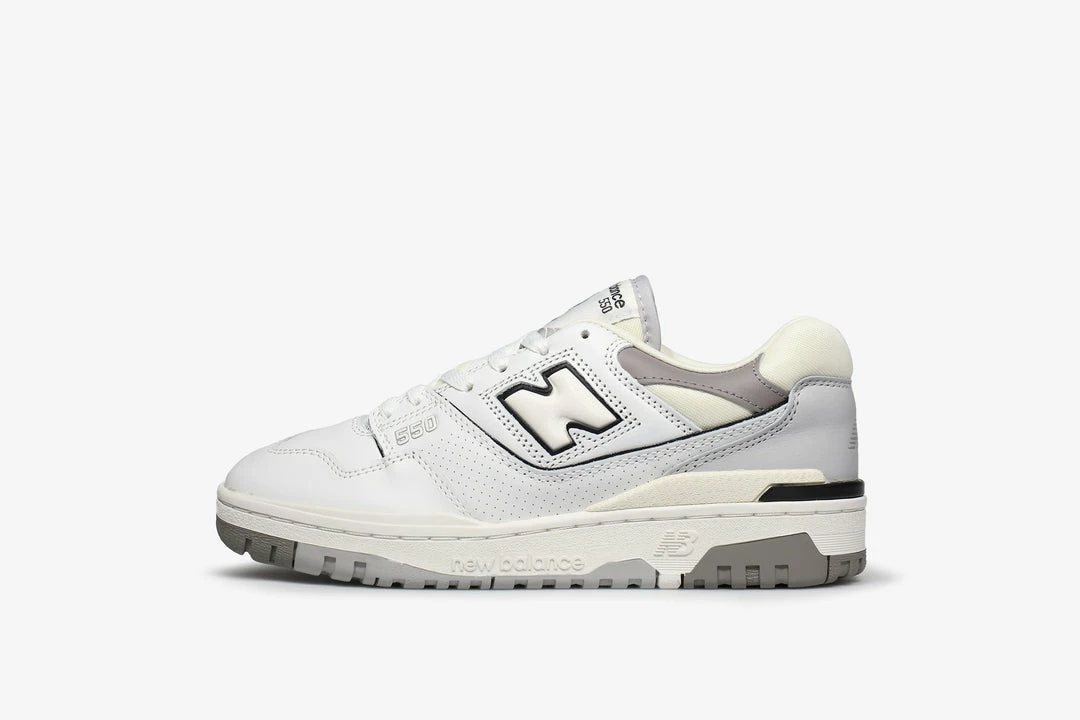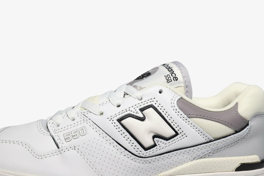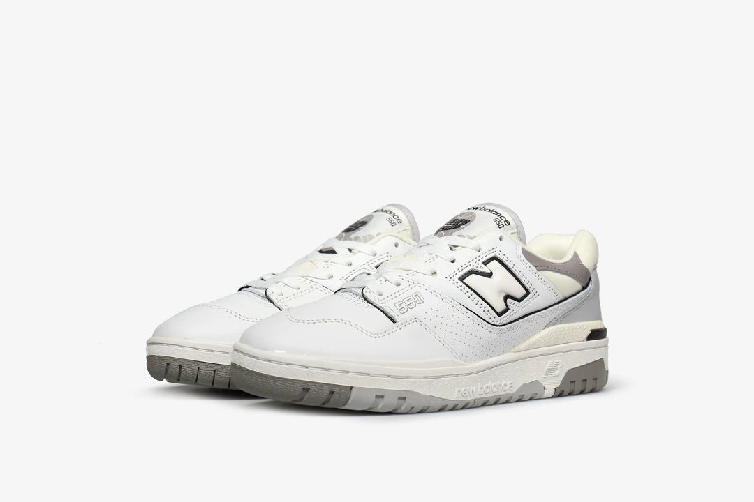 Following its reintroduction, New Balance takes inspiration from the original 550 release in 1989. The shoe features a timeless leather upper, branded tongue label, EVA midsoleย and is finished with an NBย logo on the heel. This pairย boasts a mixture of white, cream and grey on the upperย making them easilyย wearableย and effortlessly clean.ย