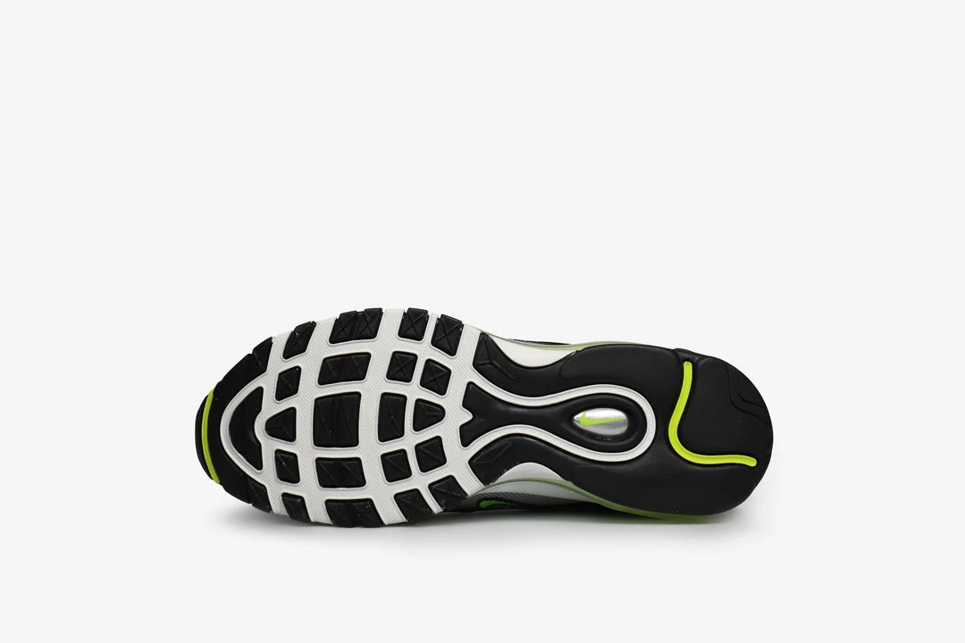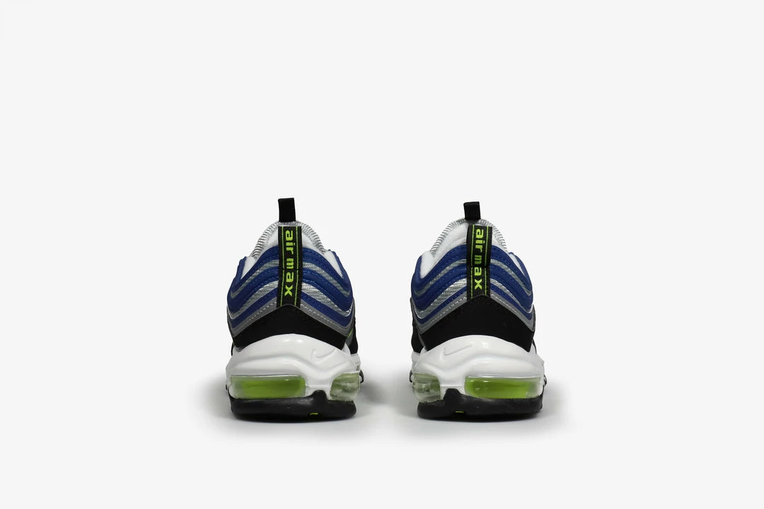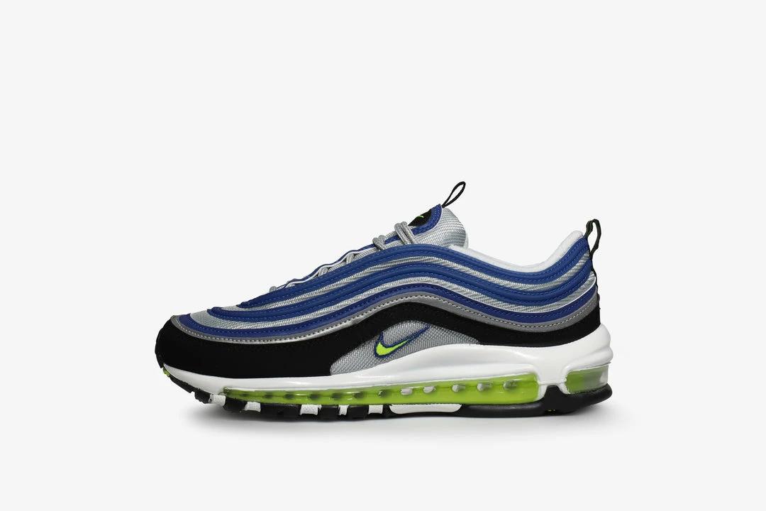 Celebrating the 35th anniversary of Air Max and the 25th anniversary of the beloved Air Max 97, this ‘Atlantic Blue’ style combines two iconic colourways last released in 2017 in one modern makeup. In classic AM97 style, Atlantic Blue and reflective-design stripes get wavy above a black mudguard, while a Voltage Yellow Air Max unit and Swoosh add an electrifying pop of colour.