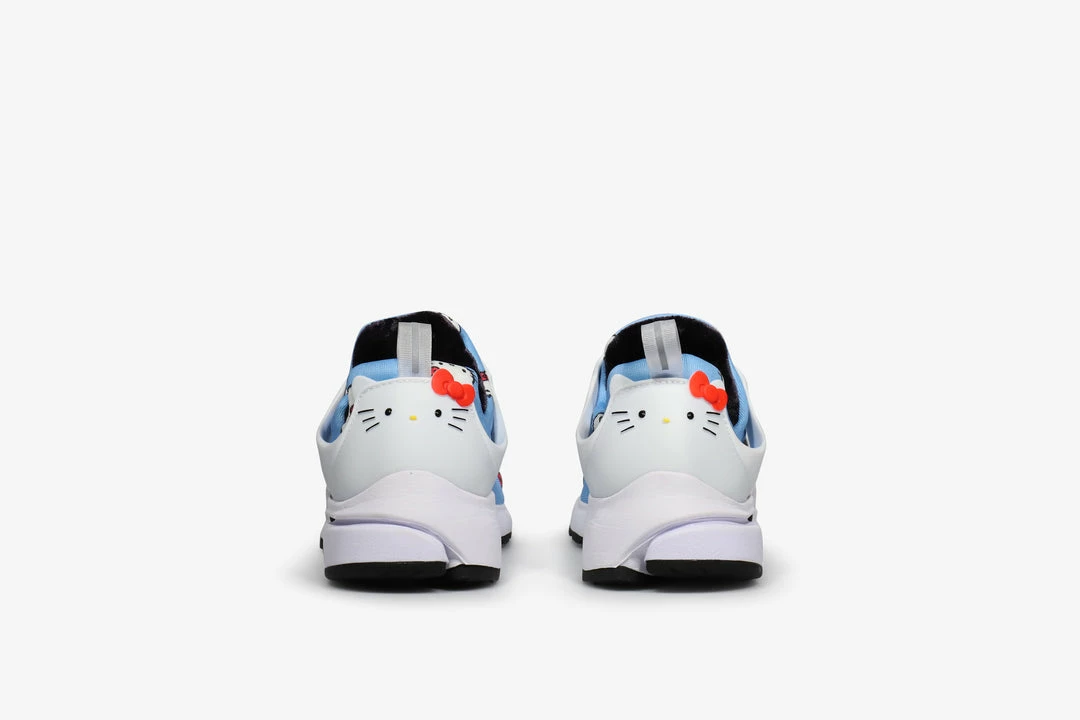 Step into a world of rainbows and sunshine with the Nike Air Presto x Hello Kitty. From the custom moulded Hello Kitty heel to her red bow on the tongue, your favourite super-cute cartoon character joins your journey. The stretchy spacer fabric on the upper is dressed with a Hello Kitty graphic while the tongue features her red bow. The sockliner graphic takes you into Hello Kitty’s world while the 5 dots on the midsole (a reference to the Nike Alpha Project, from which the classic Air Presto emerged) are coloured as Hello Kitty’s face. Complete with a custom box.