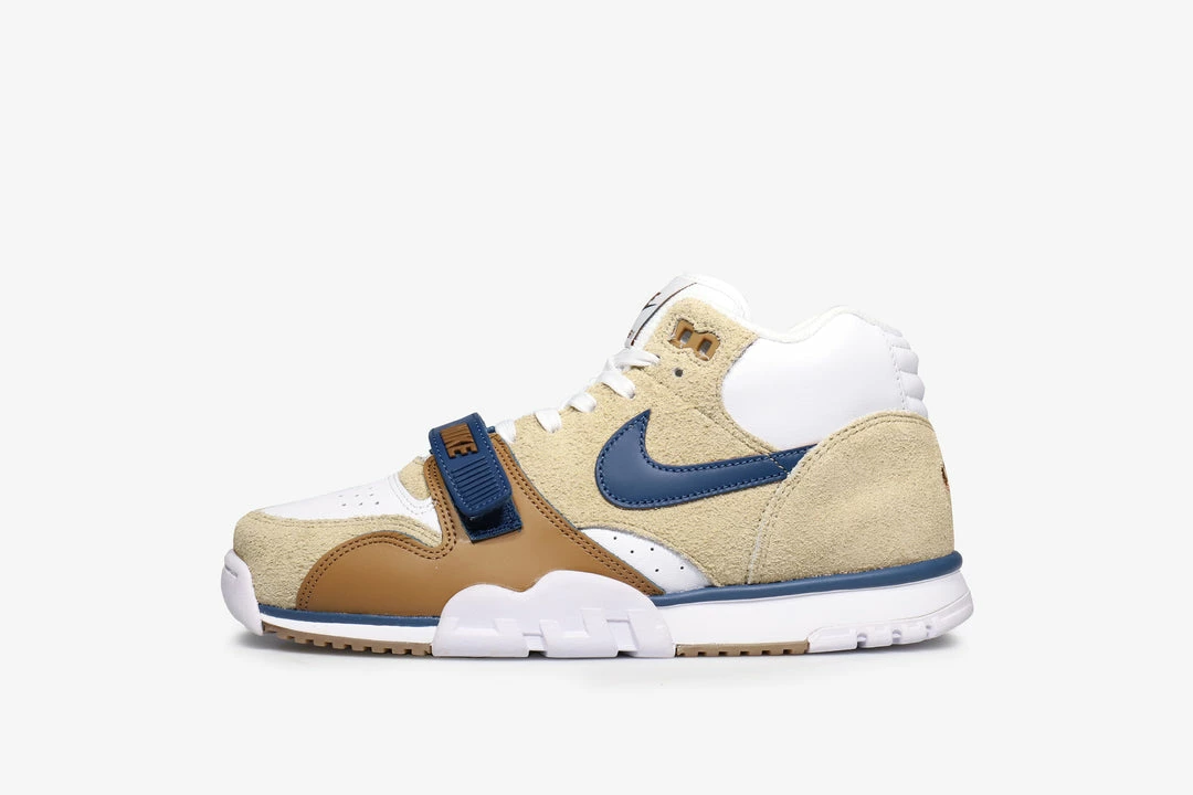 Designed by Tinker Hatfield and first released in 1987, the Nike Air Trainer 1 is celebrated as one of Nike’s most legendary shoes. It’s gone from gym champion to wardrobe staple with adaptable looks and uncompromising comfort.Β light beigeΒ suede overlays elevate the look and feel, while theΒ petrol blueΒ Swoosh, forefoot strap and outsole add retro appeal that’s easy to style.