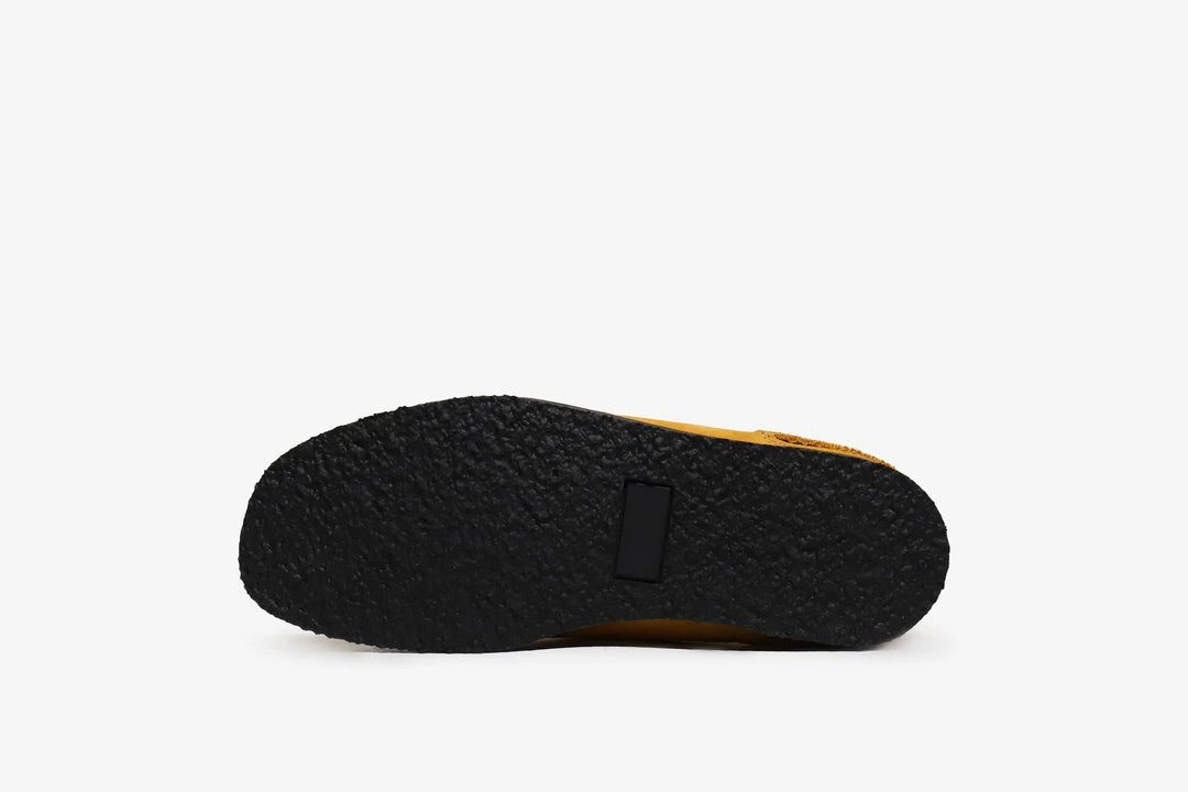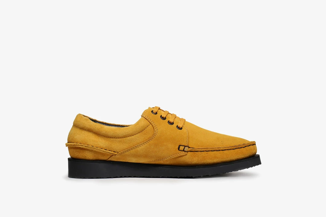 HANON and the Original Padmore & Barnes present a collaborative make-up of the Higgins leisure shoe. Originally released as a boat-shoe inspired silhouette in 1978, the Higgins has a moccasin type construction with a refined and understated profile. Handcrafted in Portugal using the finest Italian velour suedes, the heavy-duty moccasin stitch is called out and contrasts whilst a plush calfskin leather is applied to the entirety of the lining. Dual branding is subtly applied on our edition of the Higgins via our flame logo debossed on opposing heels and featured as a logo lockup screened on each footbed.