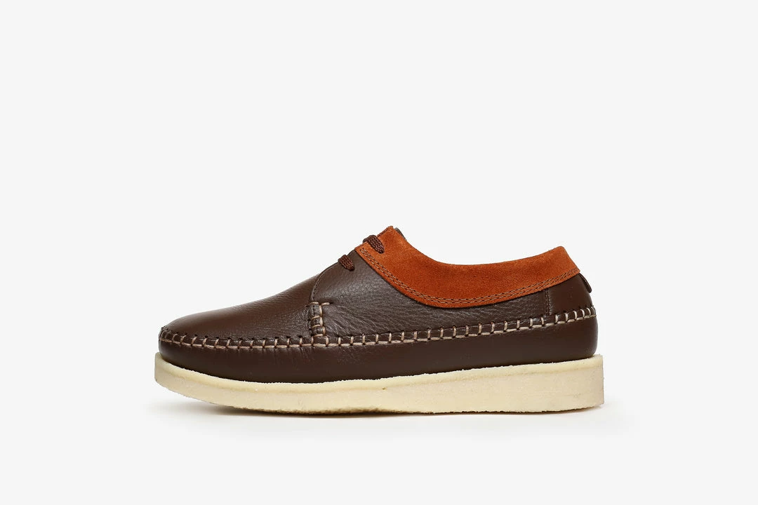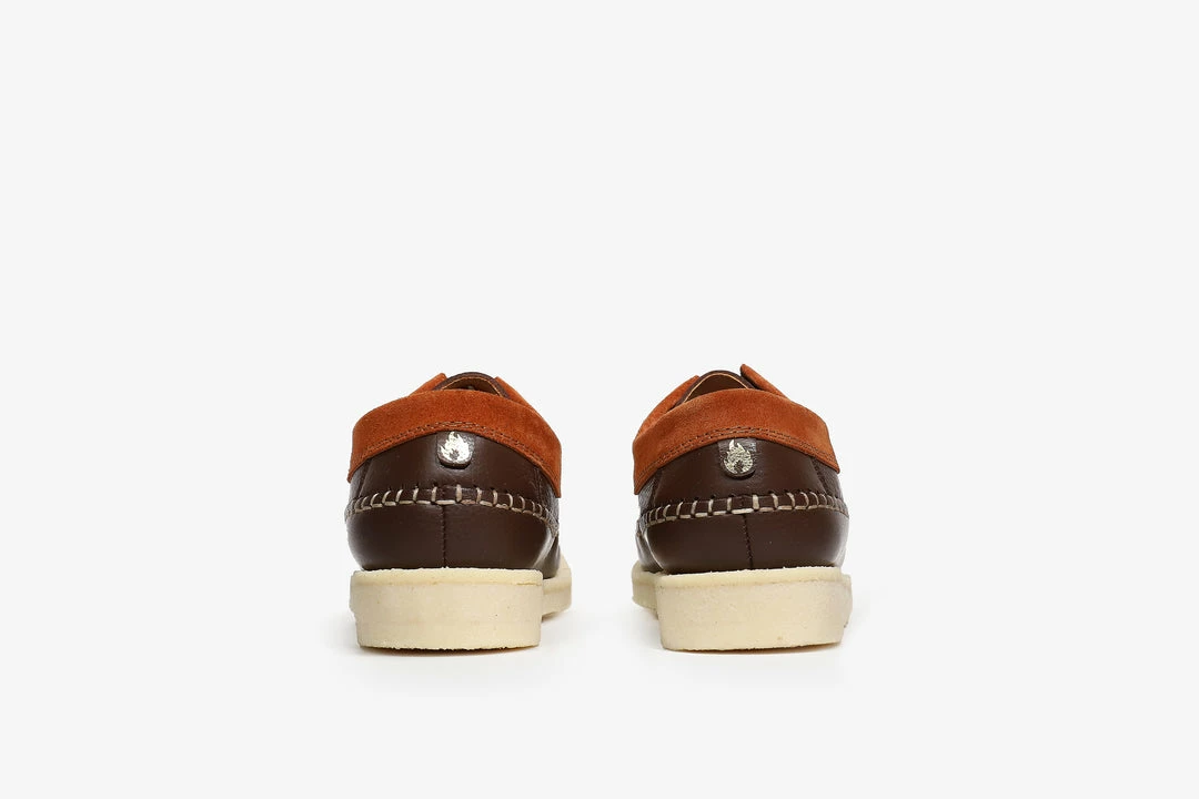 HANON and the Original Padmore & Barnes present a collaborative make-up of the classic Willow. Produced on Padmore’s Original nature form last with a moccasin-style construction, our version is hand-stitched in Portugal and constructed with No.1 plantation crepe, a rich brown leather upper contrasted with burnt orange suede, and finished with a lush leather lining, screened gold foil HANON Flame logo at the heel, and a bespoke leather insole with our logo lock-up applied via gold foil detailing.