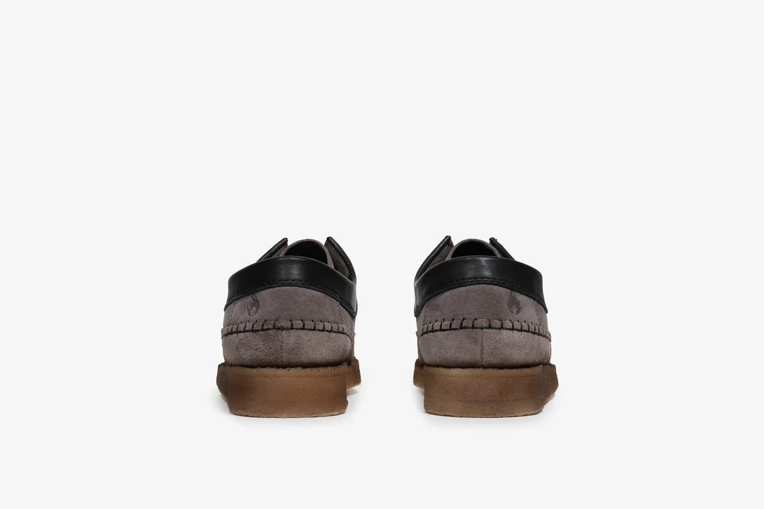 HANON and the Original Padmore & BarnesΒ present a collaborative make-up of the classic Willow. Produced on Padmoreβs Original nature form last with a moccasin-style construction,Β our versionΒ is hand-stitched in Portugal and constructed with shadow-sprayed No.1 plantation crepe, the finest Italian velour suedes, and contrasted with a leather collar.Β The shoe is finished withΒ a lush leather lining, screened gold foil HANON Flame logo at the heel, and a bespoke leather insole with our logo lock-up applied via gold foil detailing.