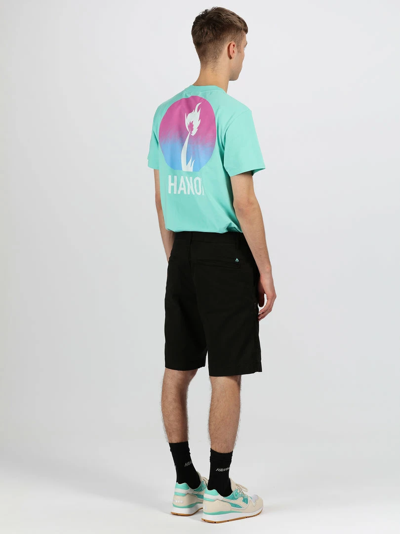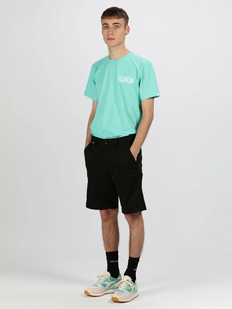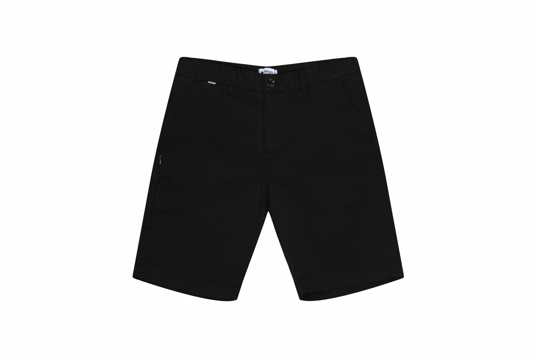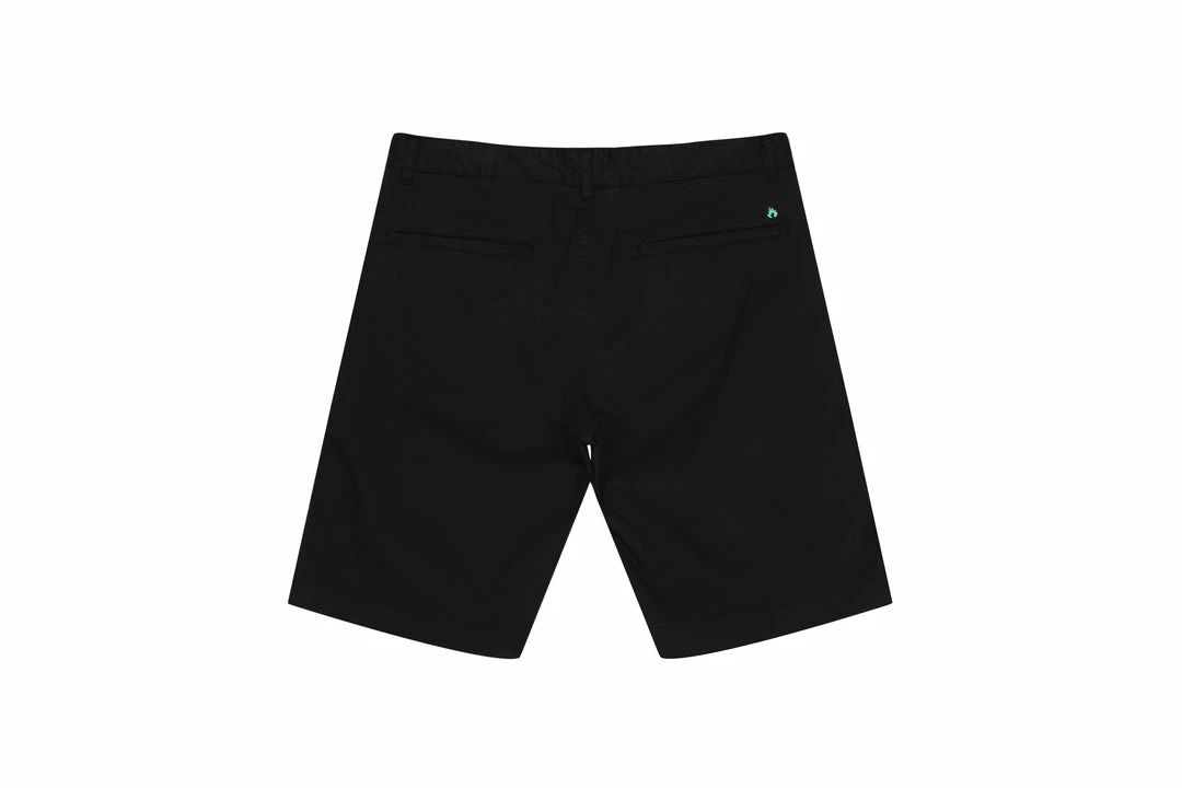 The HANON Cyrus Short in Black is crafted in Portugal using 240gr garment dyed cotton twill and features double side entry pockets, woven flag label, single welt rear pockets, flame embroidery, YKK zip fly, and a concealed zip side pocket.