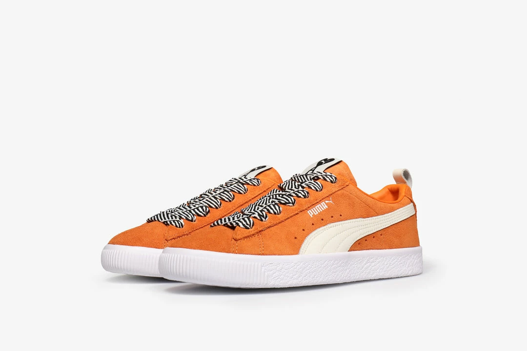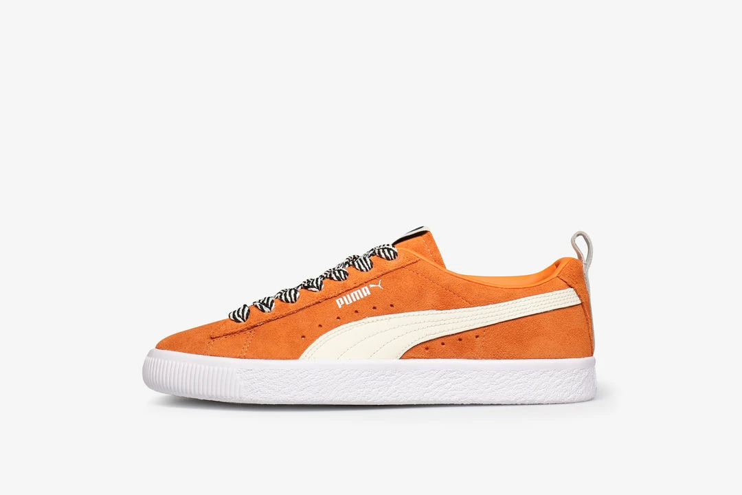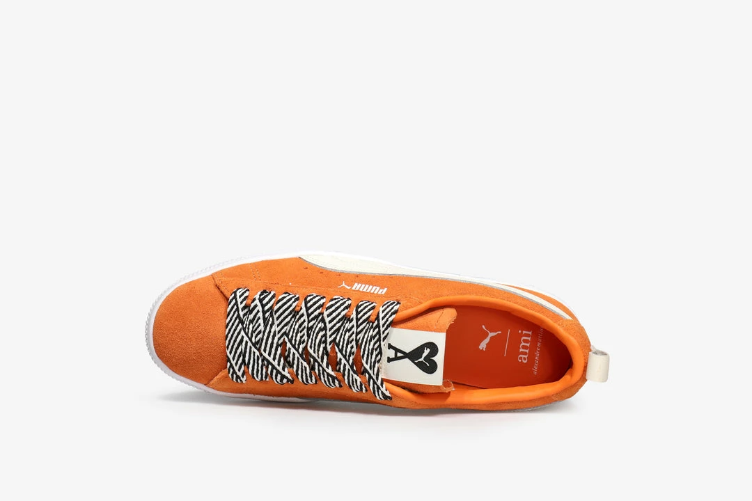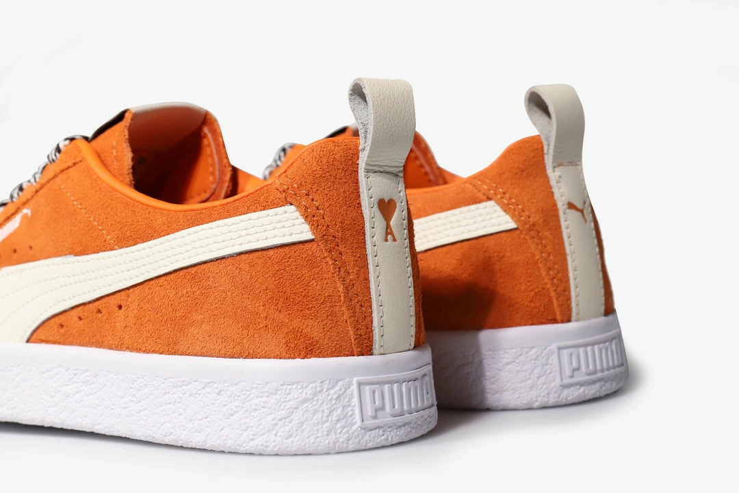 Parisian house AMI joins PUMA once againย inย aย second chapter of collaboration. The new collection blends outdoor design elements with tailoringย knowhow. Inspired by thirst for freedom and exploring new horizons, collection pieces mix PUMAโs sportswear heritage with AMIโsย premiumย craftmanship, creating aย lineย ofย elevated outdoorย essentials. The Suede VTG from the collection comes in a vibrant orange suede upper with a cream formstrip flowing down the sides for that classic PUMA look. Thick black and white stripe laces add a premiumย touch.ย Collaborative branding can be found at the tongue, insole and heel.ย ย ย