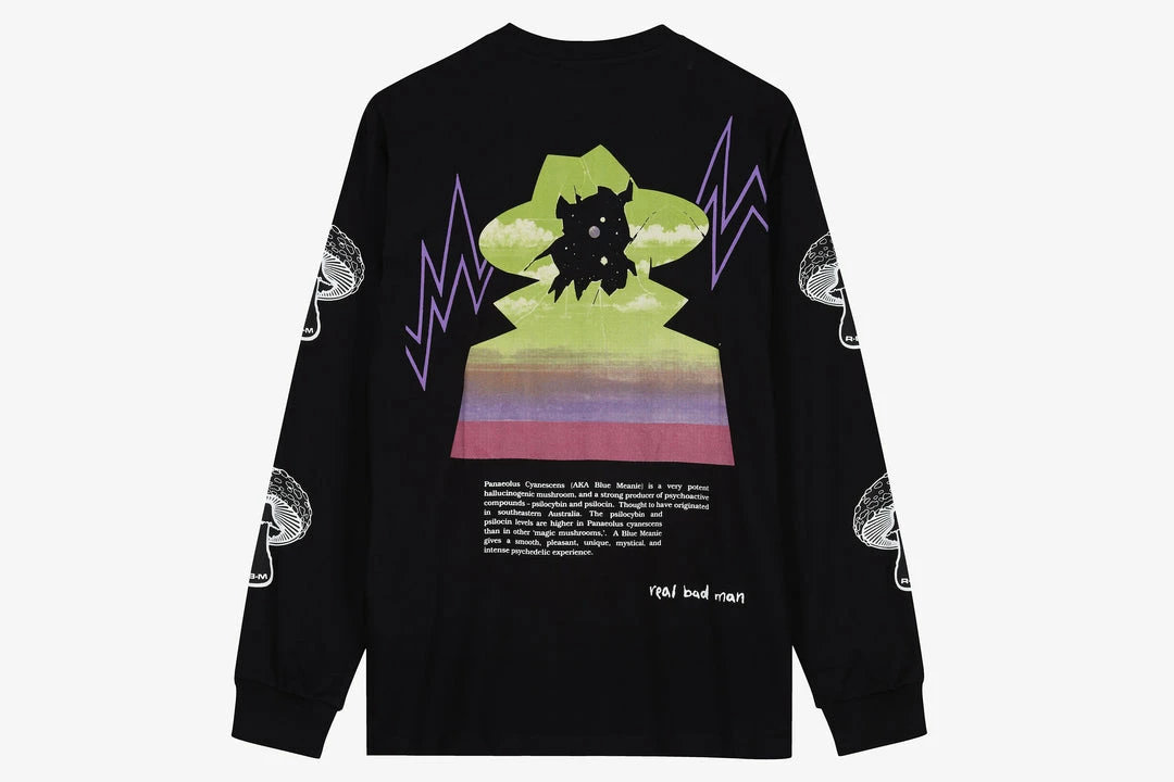 Real Bad Man are back at HANON with their FW22 collection doing what they do best. Bold & vibrant as ever this latest release from RBM continuesΒ toΒ draw inspiration fromΒ all thingsΒ psychedelic. The Blue MeanieΒ tee is crafted using 100% cotton and features mushroom themed branding screen-printed at the chest, arms and across the back.Β