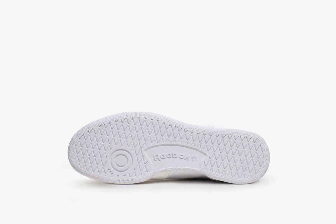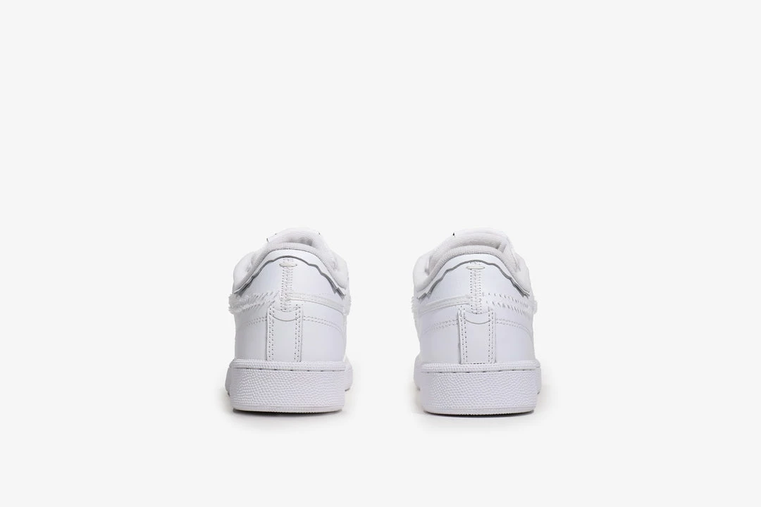 Based on Reebokβs classic design but reinterpreted through the memory of, the Classic Leather Memory Of and Club C Memory Of see the original cross-check peeled off to reveal the punch holes that once held its stitching. On the Club C Memory Of each applied leather element β including the heel tab, the cross-check and the eyelet tab β has undergone a reduction process. Some are peeled off to uncover the silver pen markings hinting at the shoemakerβs process work, while others are cut down to their structural core by way of decortiquΓ©. The shoeβs original webbing is remembered in a frayed stitch along the side, while the Reebok logo is slashed in half and fused with that of Maison Margiela β the memory of both labels in symbiosis. The Club C Memory Of is constructed in a premium leather and features a rubber cup sole with an EVA sole on the inside.