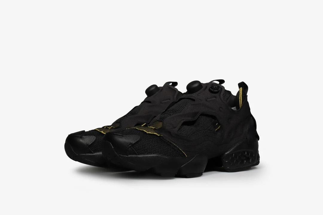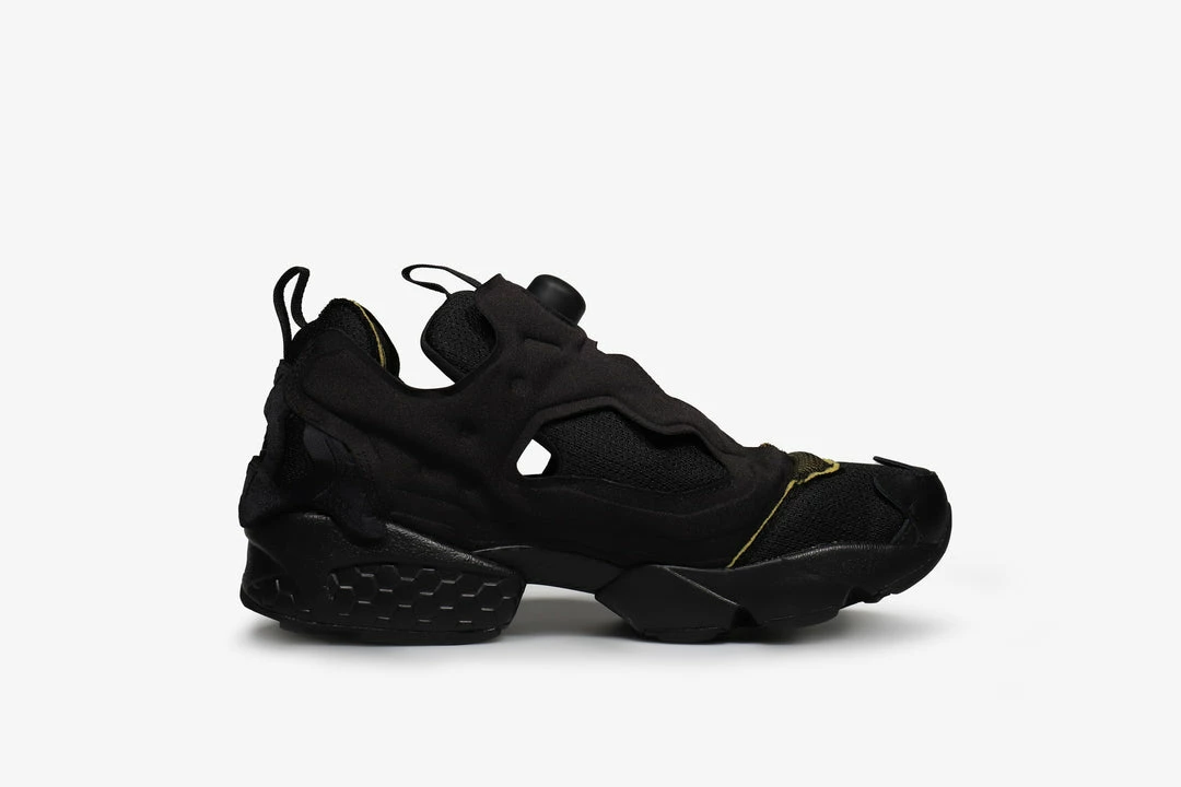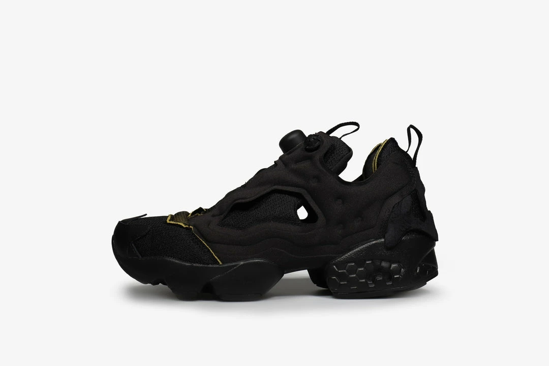 The Instapump Fury Memory Of renders the original sneaker in the vein of an exploded-view drawing, separating its familiar components to evoke its initial form. The back of the shoe is remodelled using the flexible bridges which normally appear in the middle hole of the pump bladder from which the sneaker takes its name. Utilizing Reebokβs The Pump Technology, an inflation technology developed in 1989 to offer athletes a customed, locked-in fit, the bladder itself increases in volume, adding to the floaty relief look of the design β a detail similarly echoed in the effect of the seam allowance. Peeling away the shoeβs layers, the foam around the heel is exposed in its natural colour along with mesh applied the toe. The flame-shaped mudguard around the toe box is largely stripped of seams, fuelling the three-dimensional relief impression. The Instapump Fury is constructed in mesh and fabric-covered TPU and features an EVA sole with hexalite detailing and a TPU outsole.