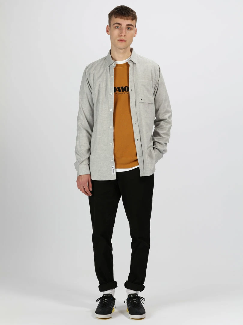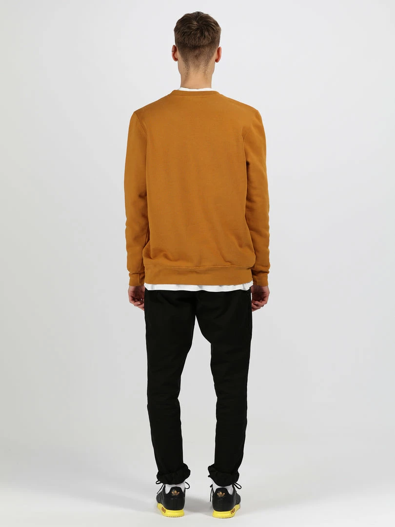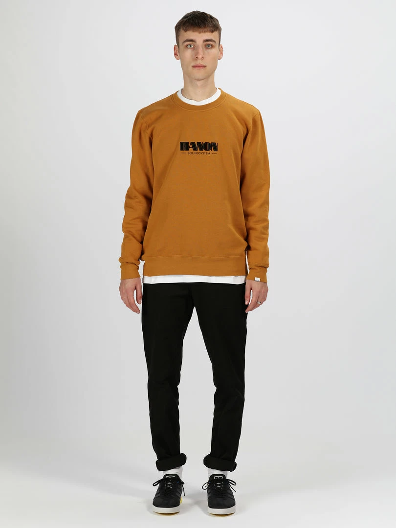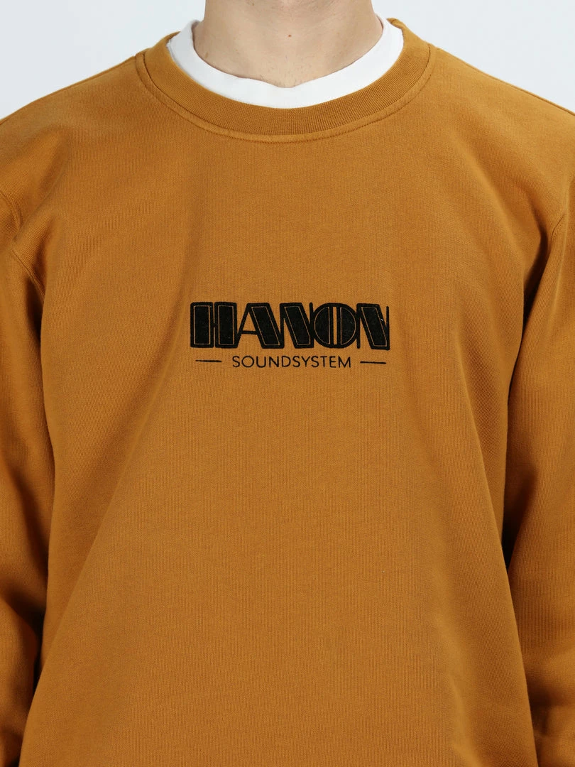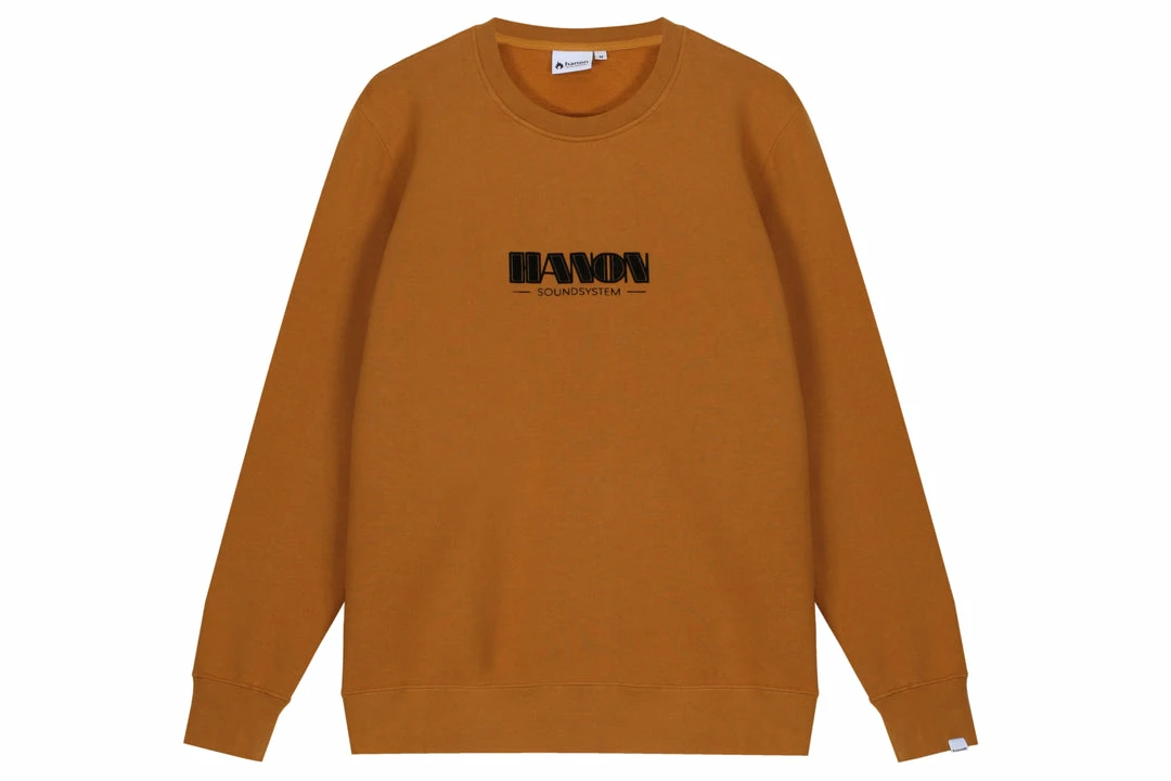 The HANON Sound System Flock Sweatshirt in Rust is crafted in Portugal using 320gr cotton fleece and features a black flocked HANON type graphic printed small on the chest.