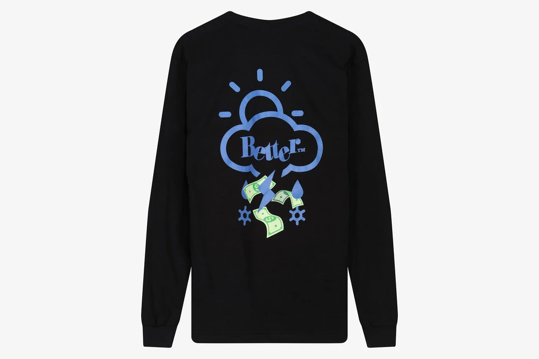 Made in the USA from 100% Cotton, theΒ Better Alwayth Money LS Tee features Better Gift Shop branding screen-printed on the chest in that vibrantΒ Better blue. The backΒ boastsΒ a larger graphic of a cloud raining money. Finished with a Better Gift Shop woven neck seam label.Β