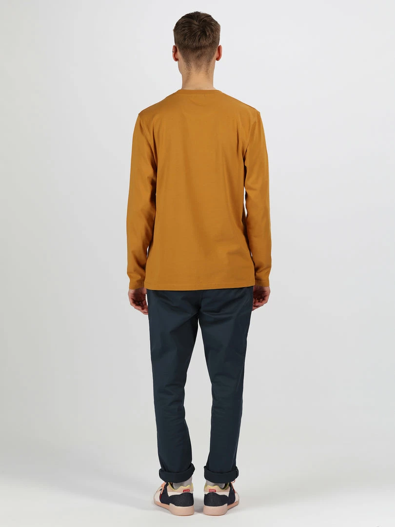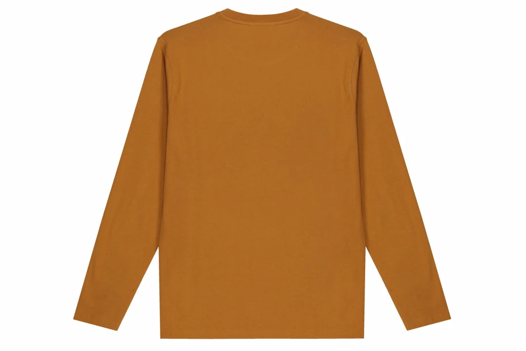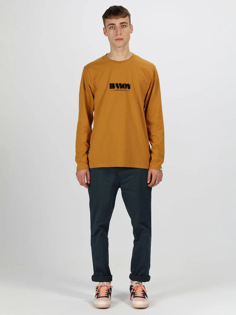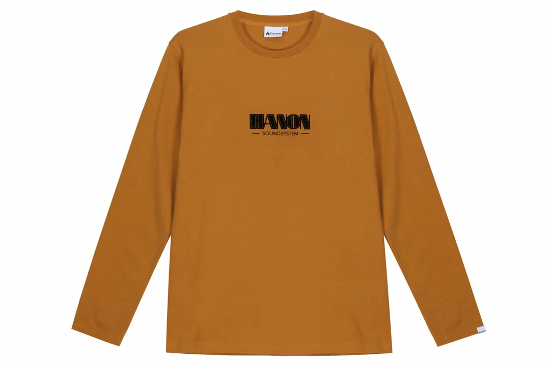 The HANON Sound System Flock LS Tee in Rust is crafted in Portugal using 160gr cotton jersey and features a black flocked HANON type graphic printed small on the chest.