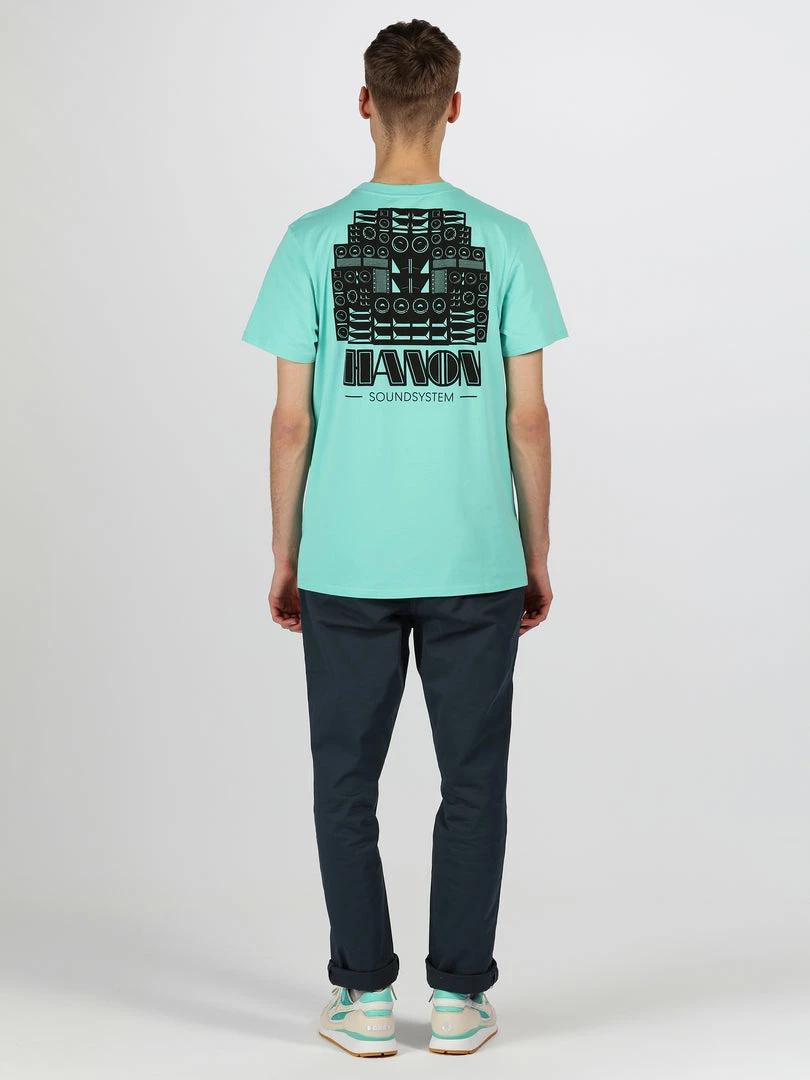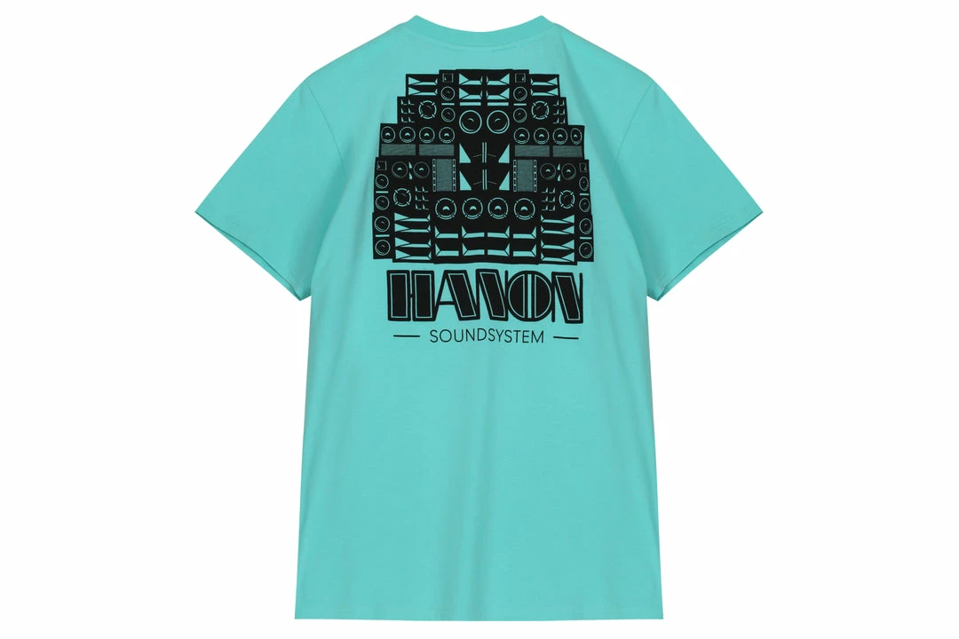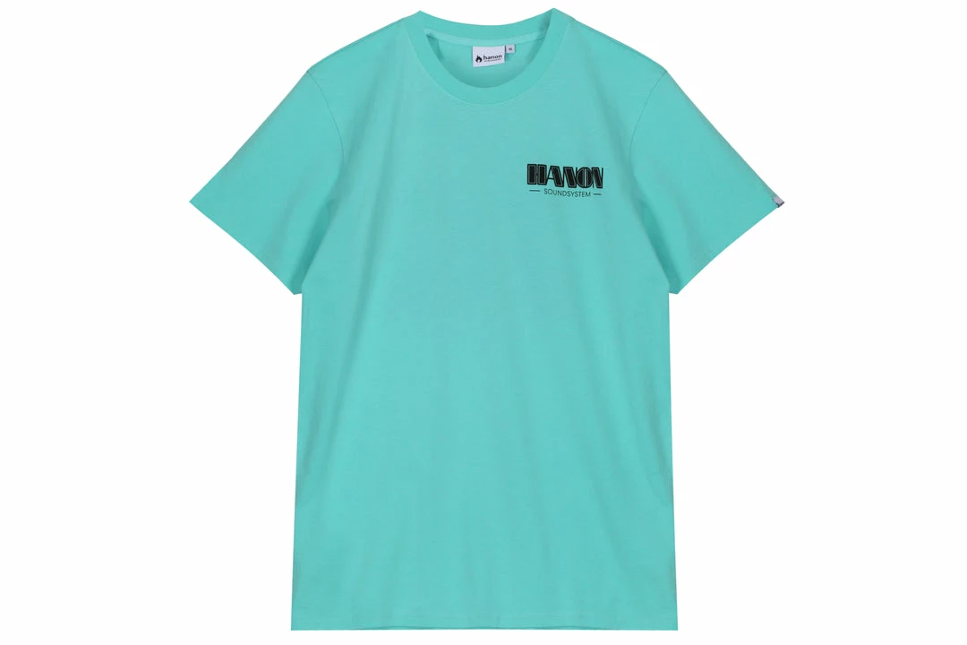The HANON Sound System Tee in Floride Mint is crafted in Portugal using 160gr cotton jersey and features our Soundsystem graphic printed small on the chest and large on the back.