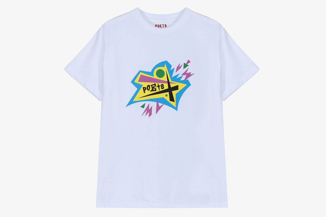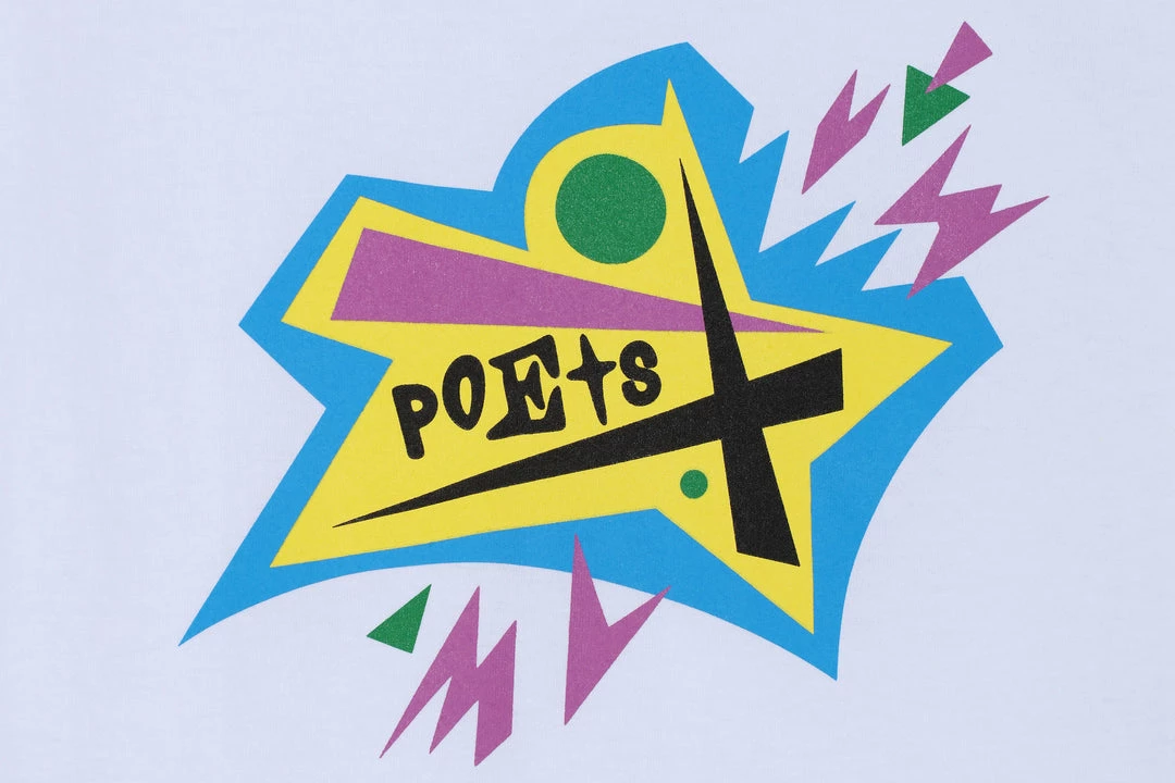 For their inaugural drop at HANON,Β POETS offer a range of streetwear staples referencing creator Gino Iannucciβs skate background and growing up in Long Island. 80βs movie references a plenty with a dash of hip hop and bright defining colours make up a strong 1st dropΒ of 2022. TheΒ Nightmare tee is a 100% cotton short sleeve t-shirtΒ featuring aΒ abstract graphic screen-printed on to the chest.