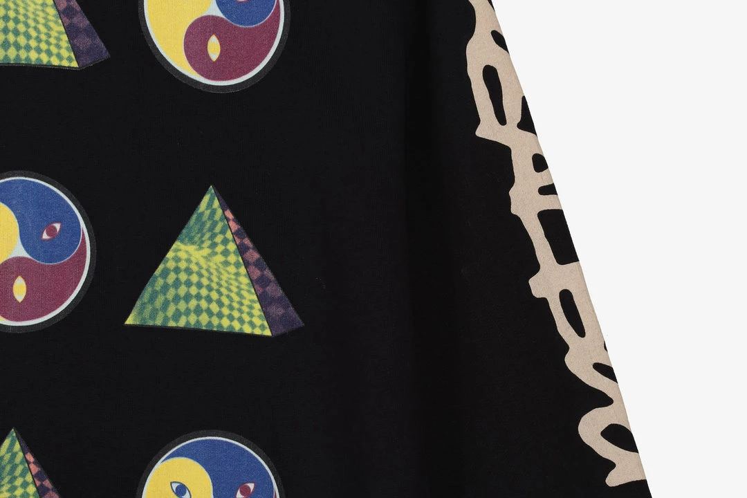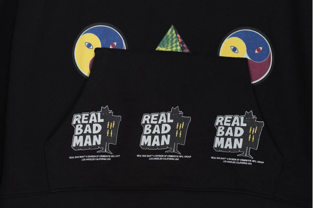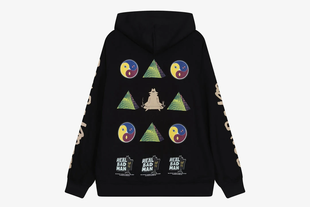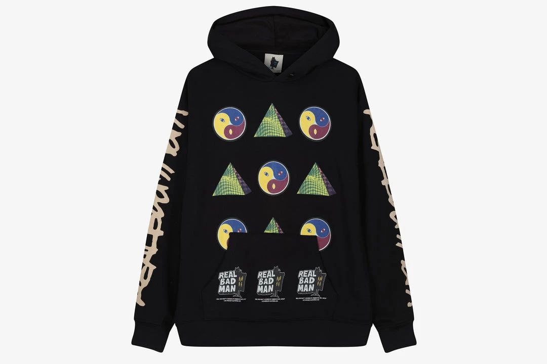 The latest drop from Adam Weissman’s Real Bad Man is packed full of niche references to music, film, Sci-Fi and pop culture that have been curated during Weissman’s time in Los Angeles. All the graphics are delivered in the technicolour style that the brand is best known for, full of colour and personality. Less is never more at the Real Bad Man headquarters. A hooded sweat that doesn’t hold back, both the front and back of the garment come adorned with a grid of repeat graphics, including a trio of RBM typographic logos. The sleeves aren’t left bare either, with a custom script font to compliment the broad ensemble of visuals. A nice touch can be found at the seam of the hood, with an embroidered RBM motif.Β