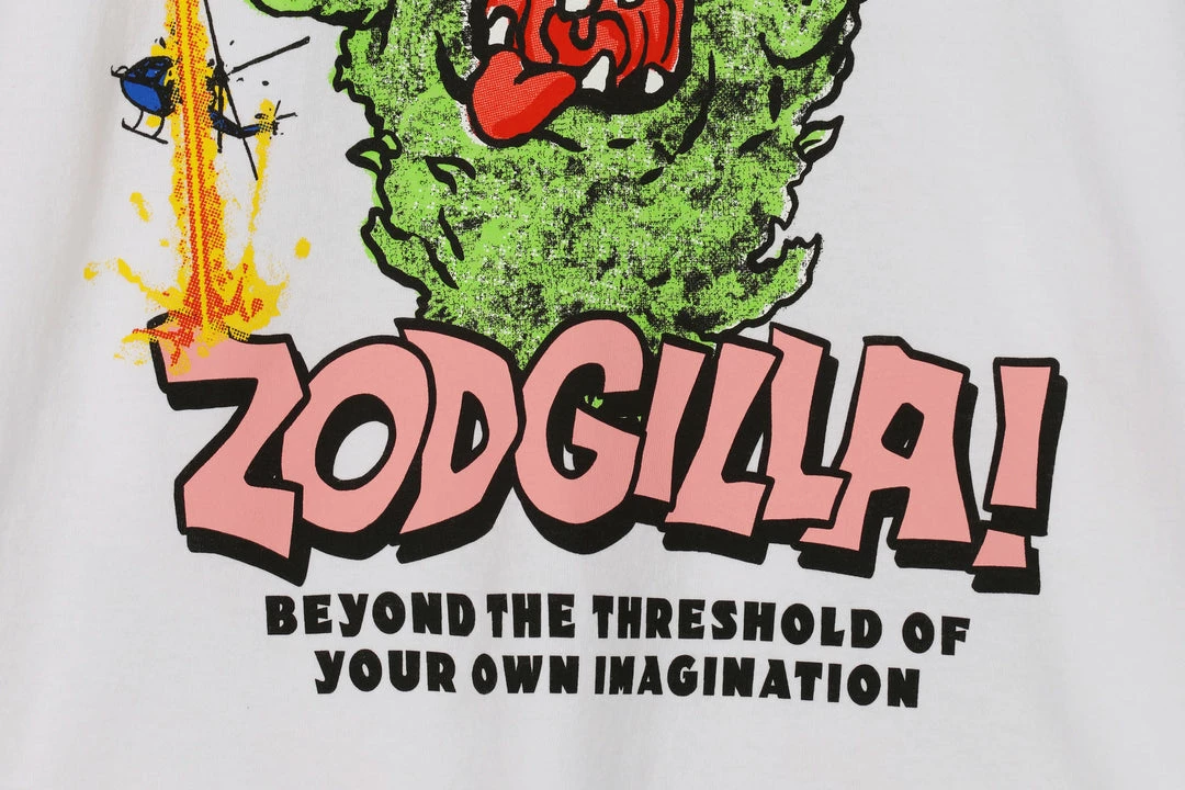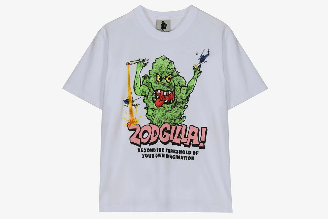 The latest drop from Adam Weissman’s Real Bad Man is packed full of niche references to music, film, Sci-Fi and pop culture that have been curated during Weissman’s time in Los Angeles. All the graphics are delivered in the technicolour style that the brand is best known for, full of colour and personality. Less is never more at the Real Bad Man headquarters. The tongue-in-cheek interpretation of the movie classic Godzilla, creating a formidable THC monster raining havoc over the city on the front print, this tee is a statement in itself. The fun doesn’t stop there, with a repeat pattern of the Zodgilla graphic amongst the classic Real Bad Man character, some accompanying script runs by the hem of the tee.