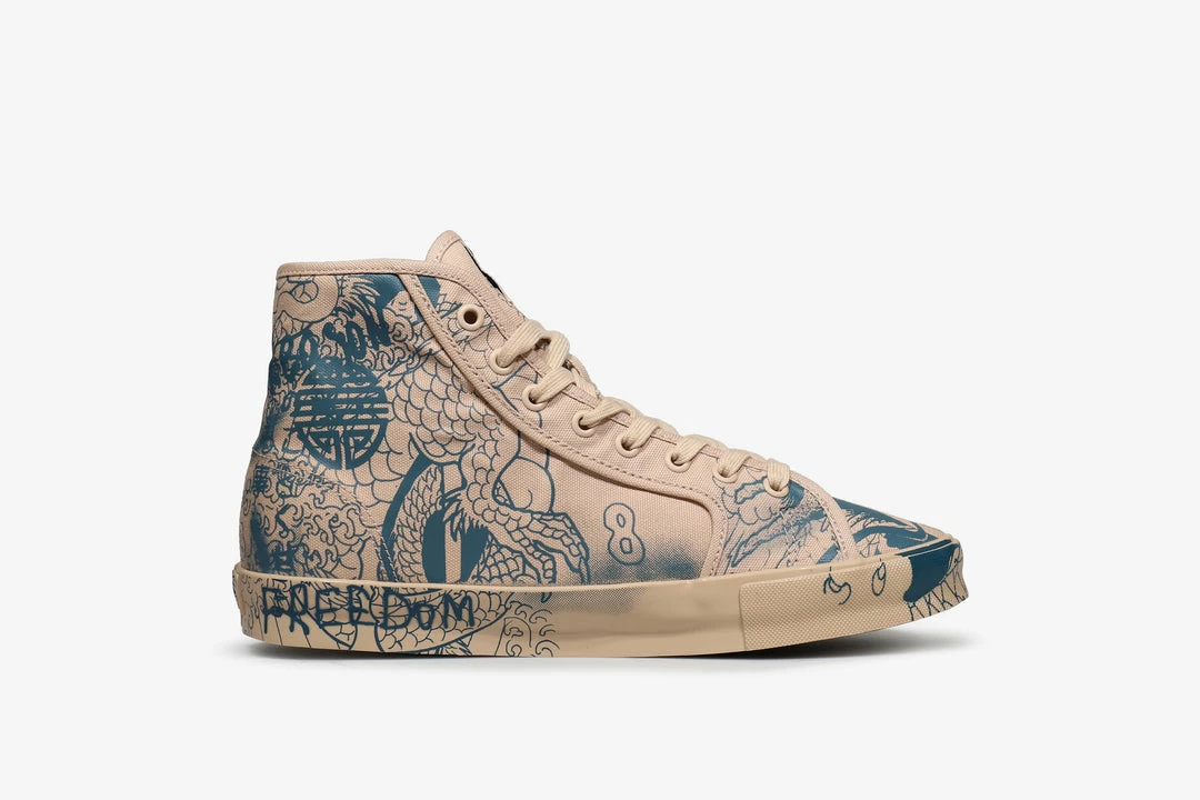 October sees Vans Vault join forces with TTSWTRS to present a four-shoe capsule drop that draws on Ukrainian designerΒ Anna Osmekhina’s memories and sees iconic Vans style adorned with tattoo-inspired graphics across monochromatic takes on the recognised Vans Vault styles. Here is a tried and tested Vans canvas upper detailed with printed branding evokingΒ tattoo-sleeve style artworks.