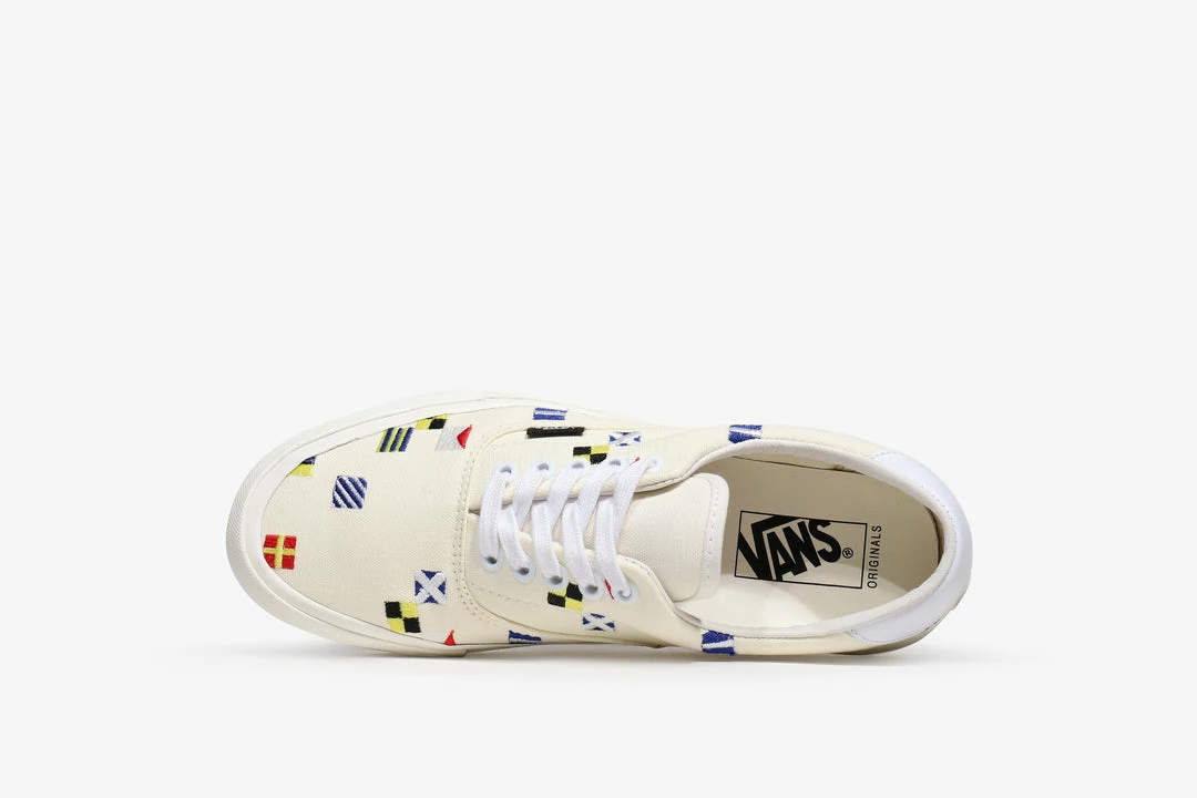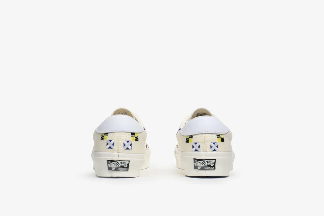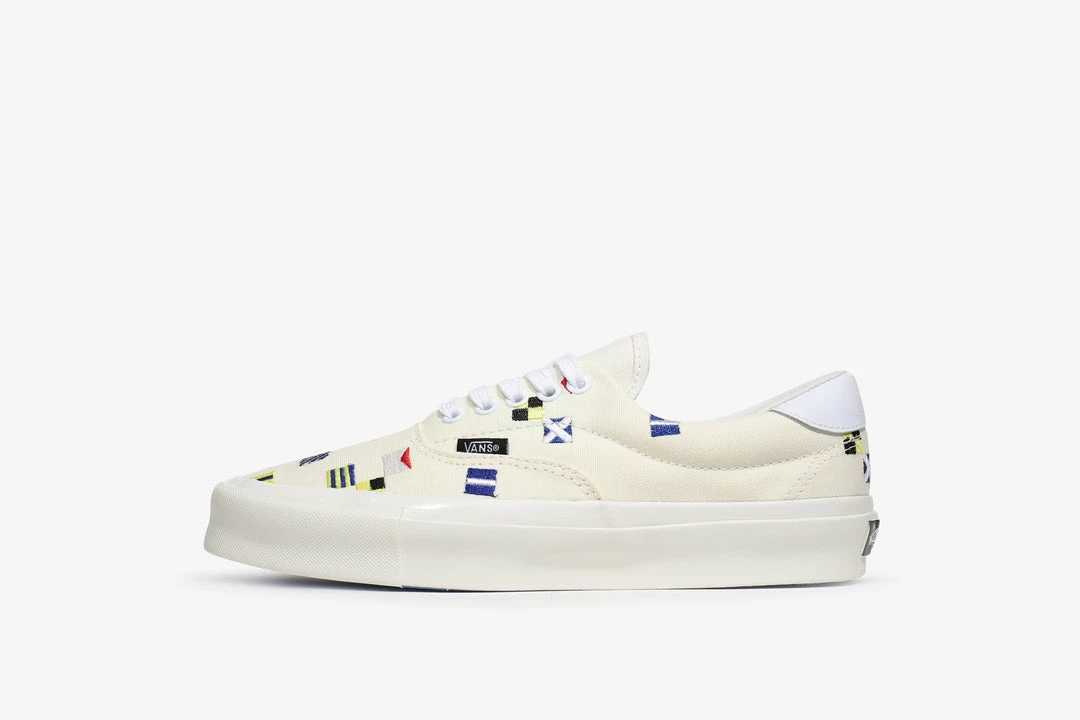 Vans Vault Style 45 arrives with a maritime-themed classic white canvas upper covered from heel to toe in embroidered flags. The signal flag upper runs above the classic Vans vulcanised sole unit however the usual waffle rubber outsole is replaced by a smooth blue sole. Finished with a black Vans heel scab.
